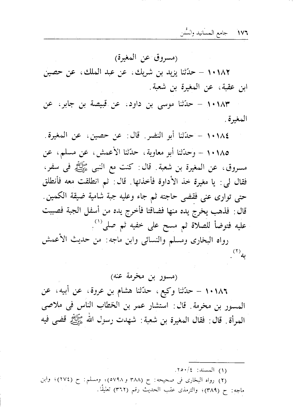 10185 - وحدثنا أبو معاوية، حدثنا الأعمش، عن مسلم، عن مسروق، عن المغيرة بن شعبة. قال: كنت مع النبى - صلى الله عليه وسلم - فى سفر، فقال لى: يا مغيرة خذ الأداوة فأخذتها. قال: ثم انطلقت معه فأنطلق حتى توارى عنى فقضى حاجته ثم جاء وعليه جبة شامية ضيقة الكمين.
