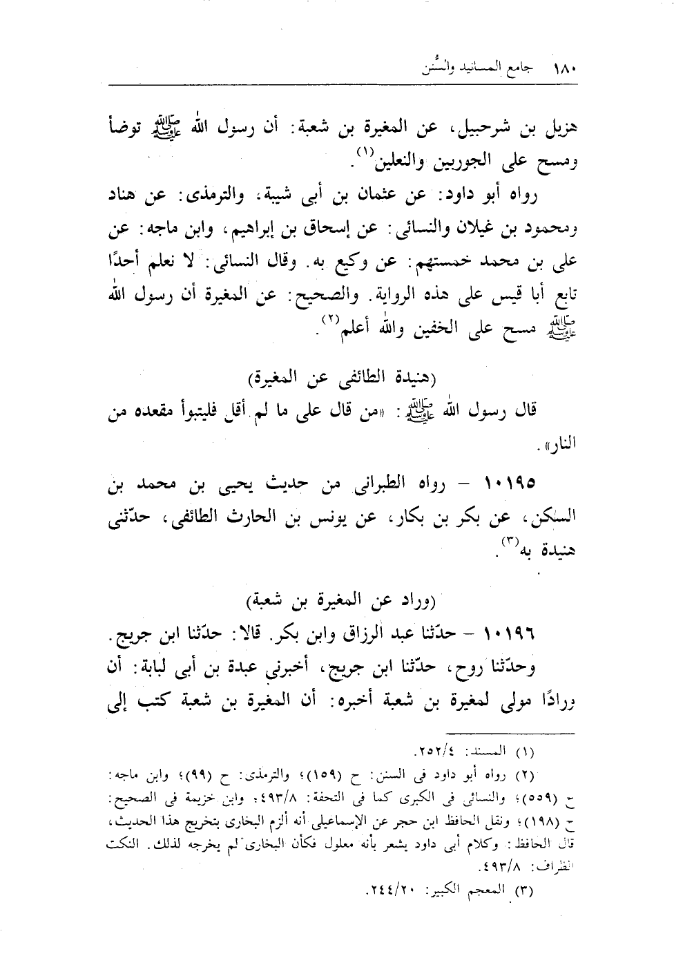رواه أبو داود: عن عثمان بن أبى شيبة، والترمذى: عن هناد ومحمود بن غيلان والنسائى: عن إسحاق بن إبراهيم، وابن ماجه: عن على بن محمد خمستهم: عن وكيع به. وقال النسائى: لا نعلم أحدا تابع أبا قيس على هذه الرواية. والصحيح: عن المغيرة أن رسول الله - صلى الله عليه وسلم - مسح على الخفين والله أعلم (¬2) .