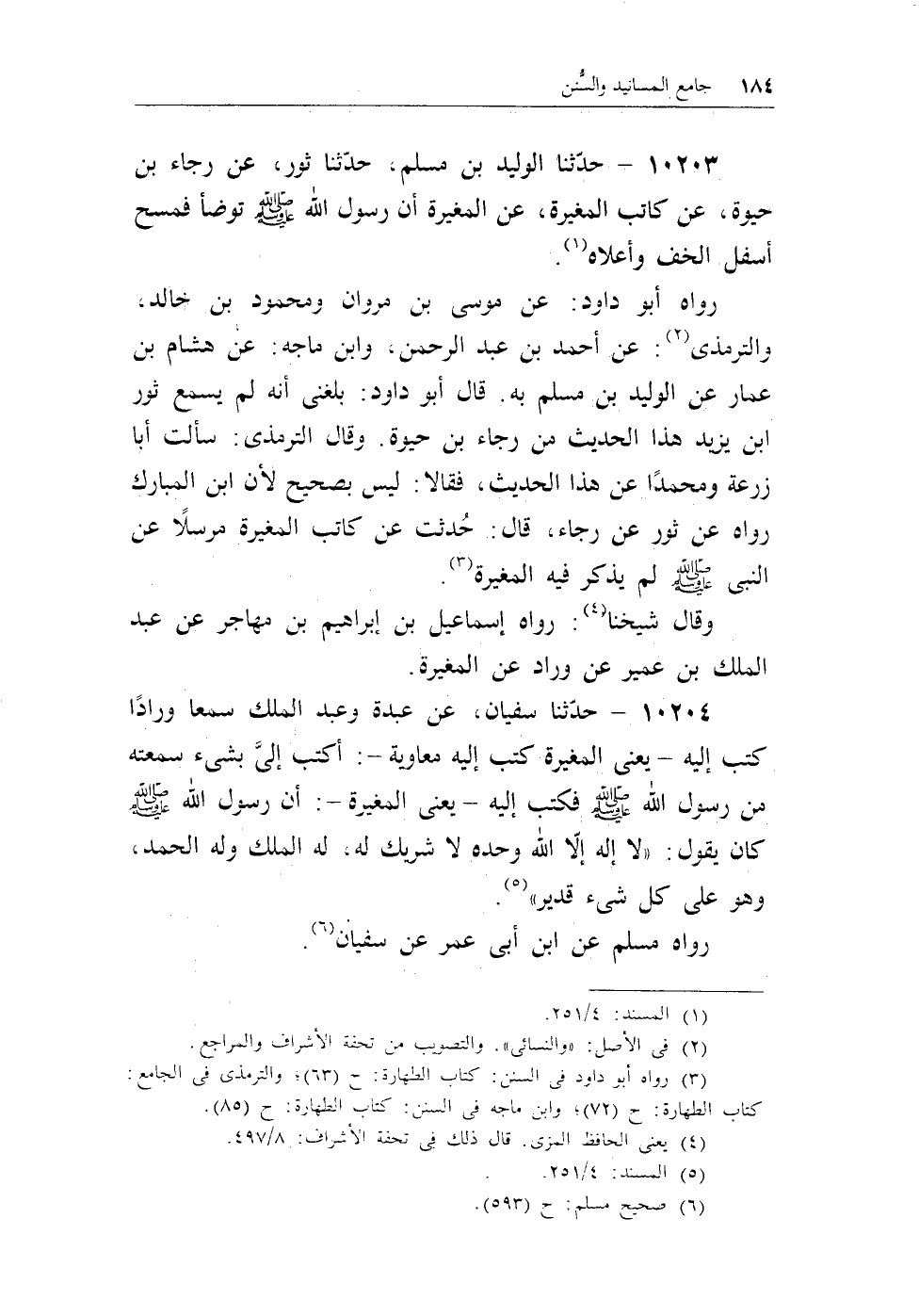 10203 - حدثنا الوليد بن مسلم، حدثنا ثور، عن رجاء بن حيوة، عن كاتب المغيرة، عن المغيرة أن رسول الله - صلى الله عليه وسلم - توضأ فمسح أسفل الخف وأعلاه (¬1) .