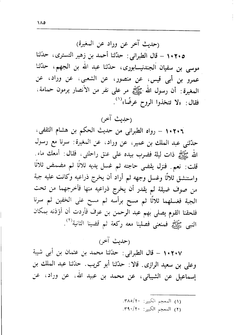 10207 - قال الطبرانى: حدثنا محمد بن عثمان بن أبى شيبة وعلى بن سعيد الرازى. قالا: حدثنا أبو كريب، حدثنا عبد الملك بن إسماعيل عن الشيبانى، عن محمد بن عبيد الله، عن وراد، عن