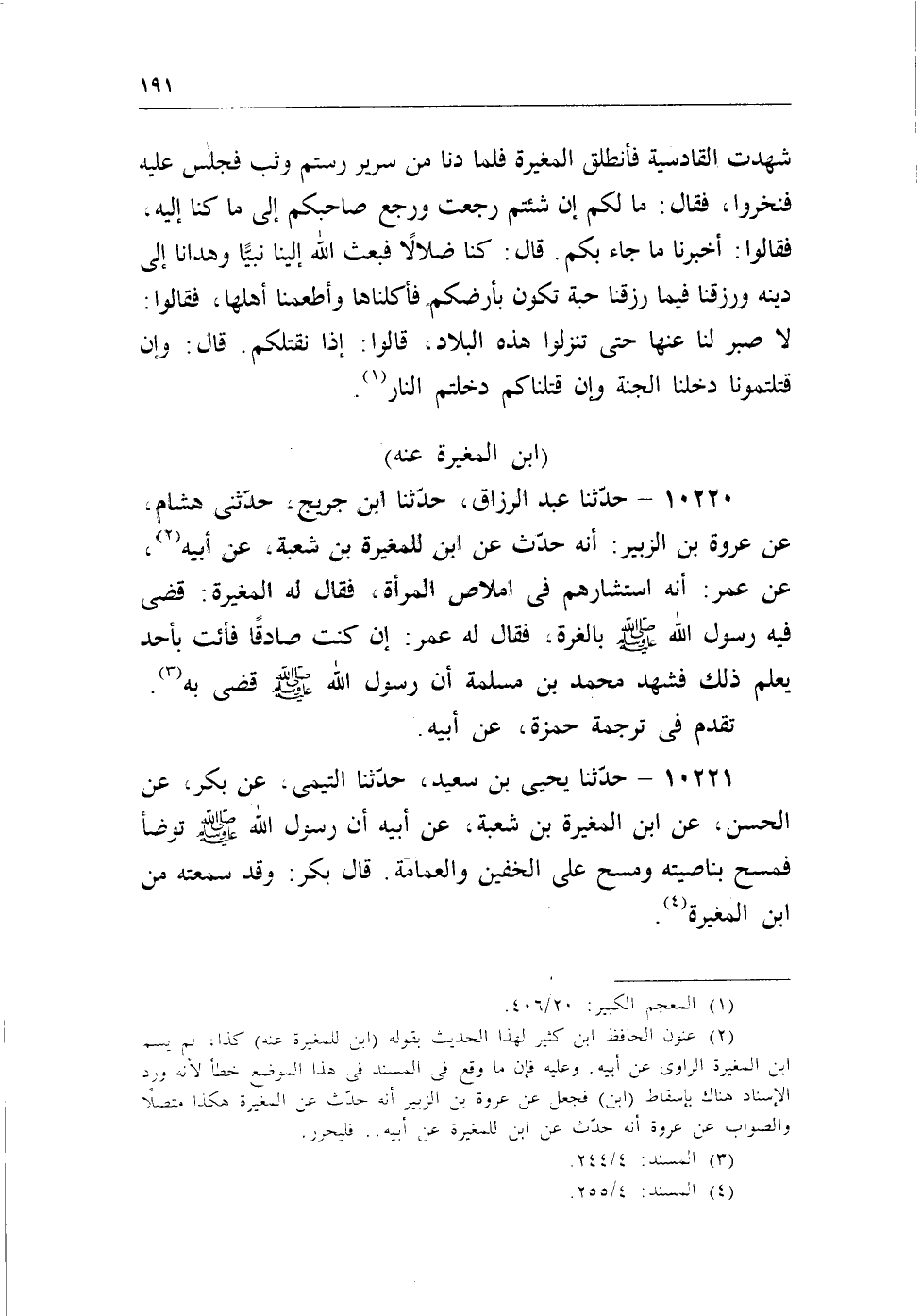 (¬1) عنون الحافظ ابن كثير لهذا الحديث بقوله (ابن المغيرة عنه) كذا، لم يسم ابن المغيرة الراوى عن أبيه، وعليه فإن ما وقع فى المسند فى هذا الموضع خطأ لأنه ورد الإسناد هناك بإسقاط (ابن) فجعل عن عروة بن الزبير أنه حدث عن المغيرة هكذا متصلا والصواب عن عروة أنه حدث عن ابن المغيرة عن أبيه.. فليحرر.