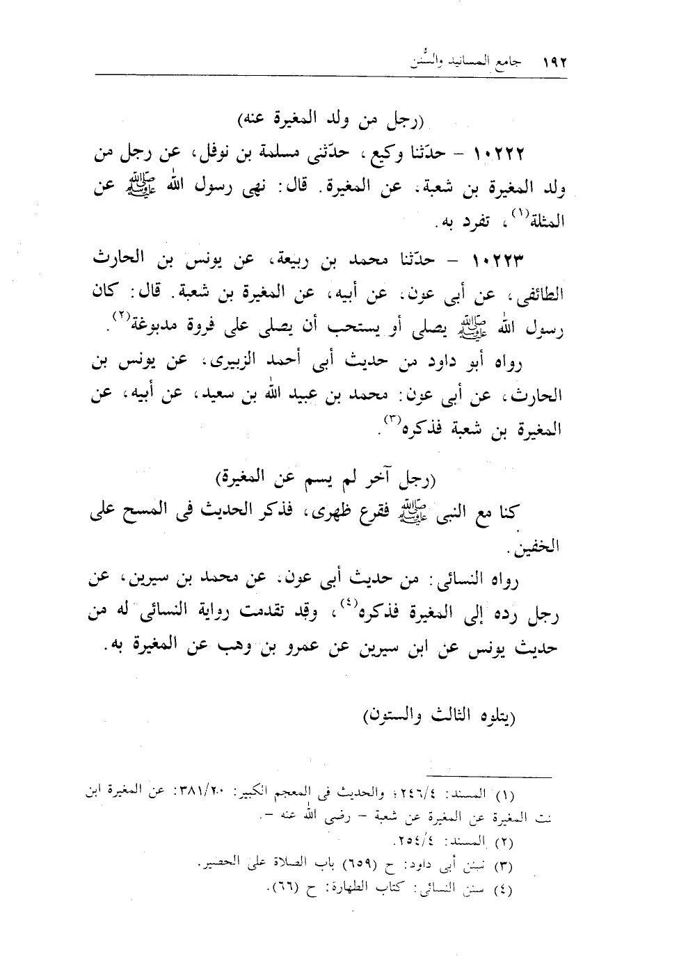 10222 - حدثنا وكيع، حدثنى مسلمة بن نوفل، عن رجل من ولد المغيرة ابن شعبة، عن المغيرة. قال: نهى رسول الله - صلى الله عليه وسلم - عن المثلة (¬1) ، تفرد به.