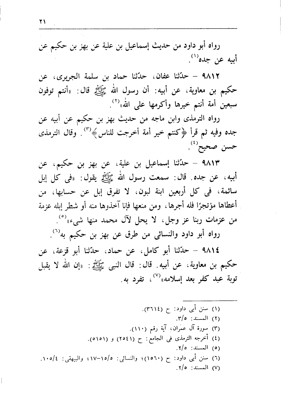 9812 - حدثنا عفان، حدثنا حماد بن سلمة الجريرى، عن حكيم بن معاوية، عن أبيه: أن رسول الله - صلى الله عليه وسلم - قال: «أنتم توفون سبعين أمة أنتم خيرها وأكرمها على الله» (¬1) .