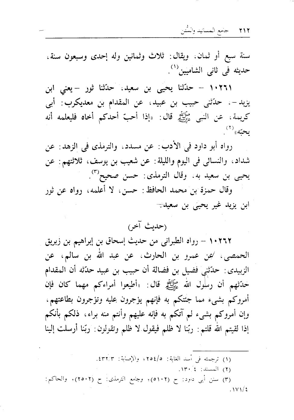 رواه أبو داود فى الأدب: عن مسدد، والترمذى فى الزهد: عن شداد، والنسائى فى اليوم والليلة: عن شعيب بن يوسف، ثلاثتهم: عن يحيى بن سعيد به. وقال الترمذى: حسن صحيح (¬2) .