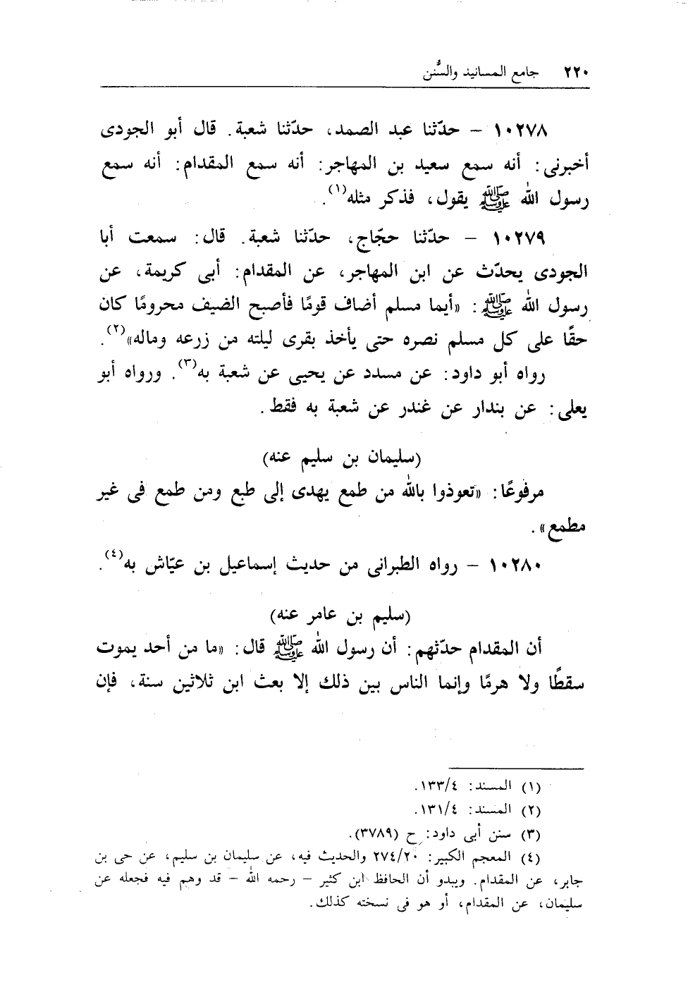 (¬4) المعجم الكبير: 20/274 والحديث فيه، عن سليمان بن سليم، عن حى بن جابر، عن المقدام. ويبدو أن الحافظ ابن كثير- رحمه الله- قد وهم فيه فجعله عن سليمان، عن المقدام، أو هو فى نسخته كذلك.