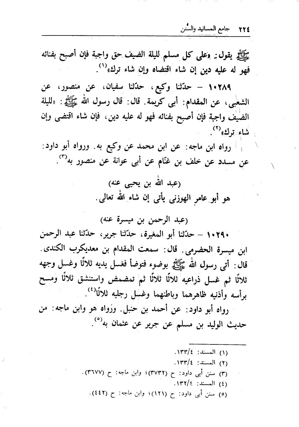 10289 - حدثنا وكيع، حدثنا سفيان، عن منصور، عن الشعبى، عن المقدام: أبى كريمة. قال: قال رسول الله - صلى الله عليه وسلم -: «لليلة الضيف واجبة فإن أصبح بفنائه فهو له عليه دين، فإن شاء اقتضى وإن شاء ترك» (¬4) .