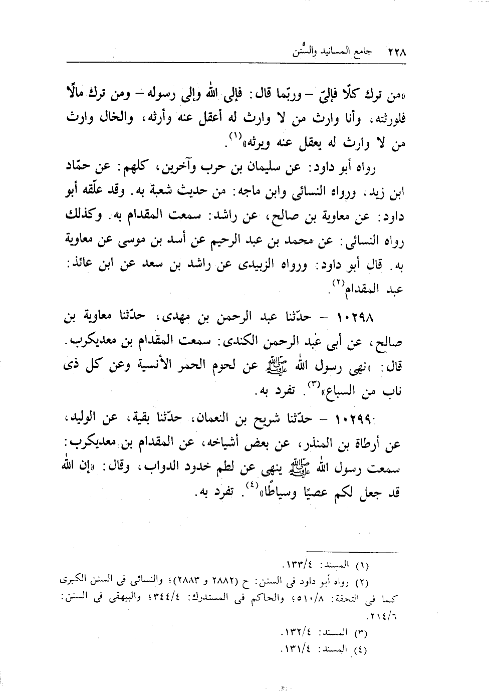 رواه أبو داود: عن سليمان بن حرب وآخرين، كلهم: عن حماد ابن زيد، ورواه النسائى وابن ماجه: من حديث شعبة به. وقد علقه أبو داود: عن معاوية بن صالح، عن راشد: سمعت المقدام به. وكذلك رواه النسائى: عن محمد بن عبد الرحيم عن أسد بن موسى عن معاوية به. قال أبو داود: ورواه الزبيدى عن راشد بن سعد عن ابن عائذ: عبد المقدام (¬2) .