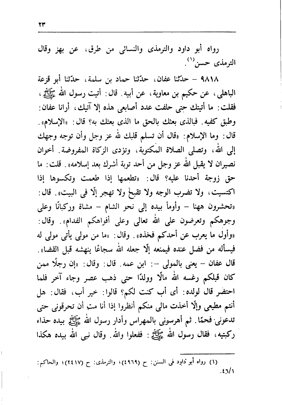 9818 - حدثنا عفان، حدثنا حماد بن سلمة، حدثنا أبو قزعة الباهلى، عن حكيم بن معاوية، عن أبيه. قال: أتيت رسول الله - صلى الله عليه وسلم -، فقلت: ما أتيتك حتى حلفت عدد أصابعى هذه إ آتيك، أرانا عفان: وطبق كفيه. فبالذى بعثك بالحق ما الذى بعثك به؟ قال: «الإسلام» . قال: وما الإسلام: «قال أن تسلم قلبك لله عز وجل وأن توجه وجهك إلى الله، وتصلى الصلاة المكتوبة، وتؤدى الزكاة المفروضة. أخوان نصيران لا يقبل الله عز وجل من أحد توبة أشرك بعد إسلامه» . قلت: ما حق زوجة أحدنا عليه؟ قال: «تطعمها إذا طعمت وتكسوها إذا اكتسيت، ولا تضرب الوجه ولا تقبح ولا تهجر إلا فى البيت» . قال: «تحشرون ههنا- وأومأ بيده إلى نحو الشام- مشاة وركبانا وعلى وجوهكم وتعرضون على الله تعالى وعلى أفواهكم الفام» . وقال: «وأول ما يعرب عن أحدكم فخذه» . وقال: «ما من مولى يأتى مولى له فسأله من فضل عنده فيمنعه غلا جعله الله سجاعا ينهشه قبل القضا» . قال عفان- يعنى بالمولى-: ابن عمه. قال: وقال: «إن رجلا ممن كان قبلكم رغسه الله مالا وولدا حتى ذهب عصر وجاء آخر فلما اختصر قال لولده: أى أب كنت لكم؟ قالوا: خير أب، فقال: هل أنتم مطيعى وإلا أخذت مالى منكم أنظروا إذا أنا مت أن تحرقونى حتى تدعونى فحما. ثم أهرسونى بالمهراس وأدار رسول الله - صلى الله عليه وسلم - بيده حذاء ركبتيه، فقال رسول الله - صلى الله عليه وسلم -: ففعلوا والله. وقال نبى الله بيده هكذا
