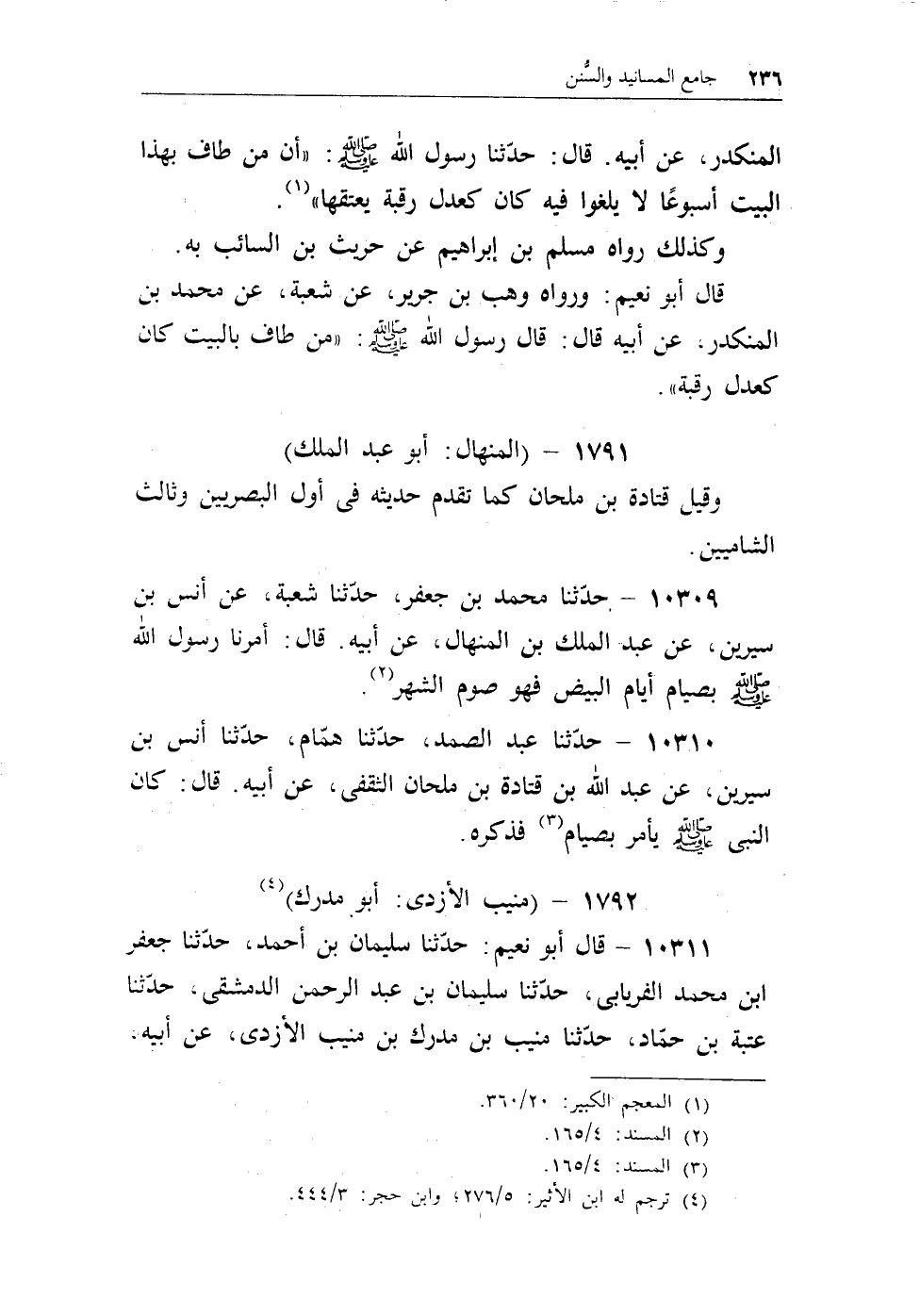 10311 - قال أبو نعيم: حدثنا سليمان بن أحمد، حدثنا جعفر ابن محمد الفريابى، حدثنا سليمان بن عبد الرحمن الدمشقى، حدثنا عتبة بن حماد، حدثنا منيب ابن مدرك بن منيب الأزدى، عن أبيه،