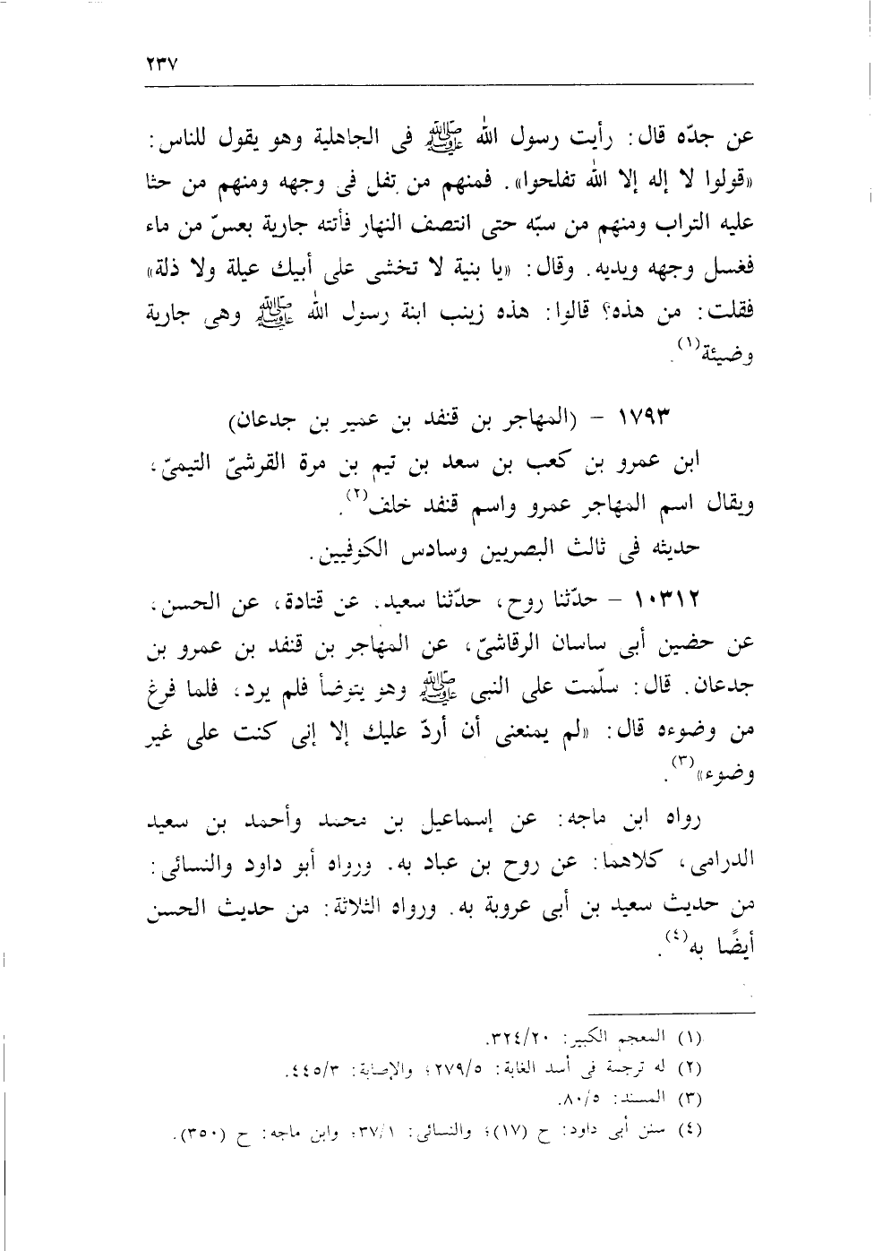 عن جده قال: رأيت رسول الله - صلى الله عليه وسلم - فى الجاهلية وهو يقول للناس: «قولوا لا إله إلا الله تفلحوا» . فمنهم من تفل فى وجهه ومنهم من حثا عليه التارب ومنهم من سبه حتى انتصف النهار فأتته جارية بعس من ماء فغسل وجهه ويديه. وقال: «يا بنية لا تخشى على أبيك عيلة ولا ذلة» فقلت: من هذه؟ قالوا: هذه زينب ابنة رسول الله - صلى الله عليه وسلم - وهى جارية وضيئة (¬1) .