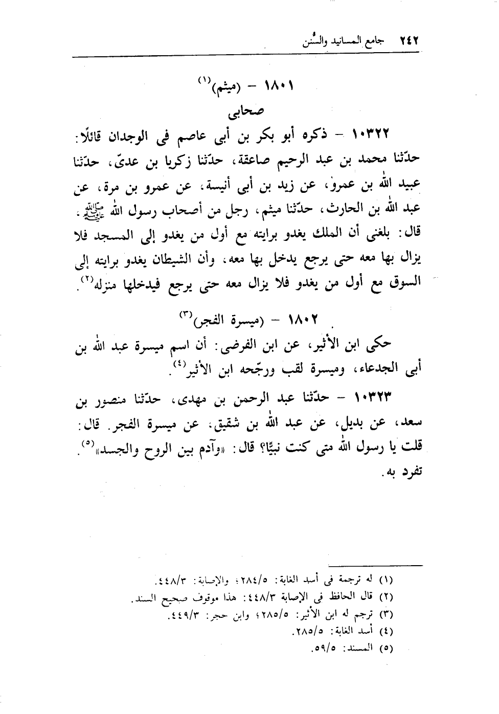 10323 - حدثنا عبد الرحمن بن مهدى، حدثنا منصور بن سعد، عن بديل، عن عبد الله بن شقيق، عن ميسرة الفجر. قال: قلت يا رسول الله متى كنت نبيا؟ قال: «وآدم بين الروح والجسد» (¬5) . تفرد به.