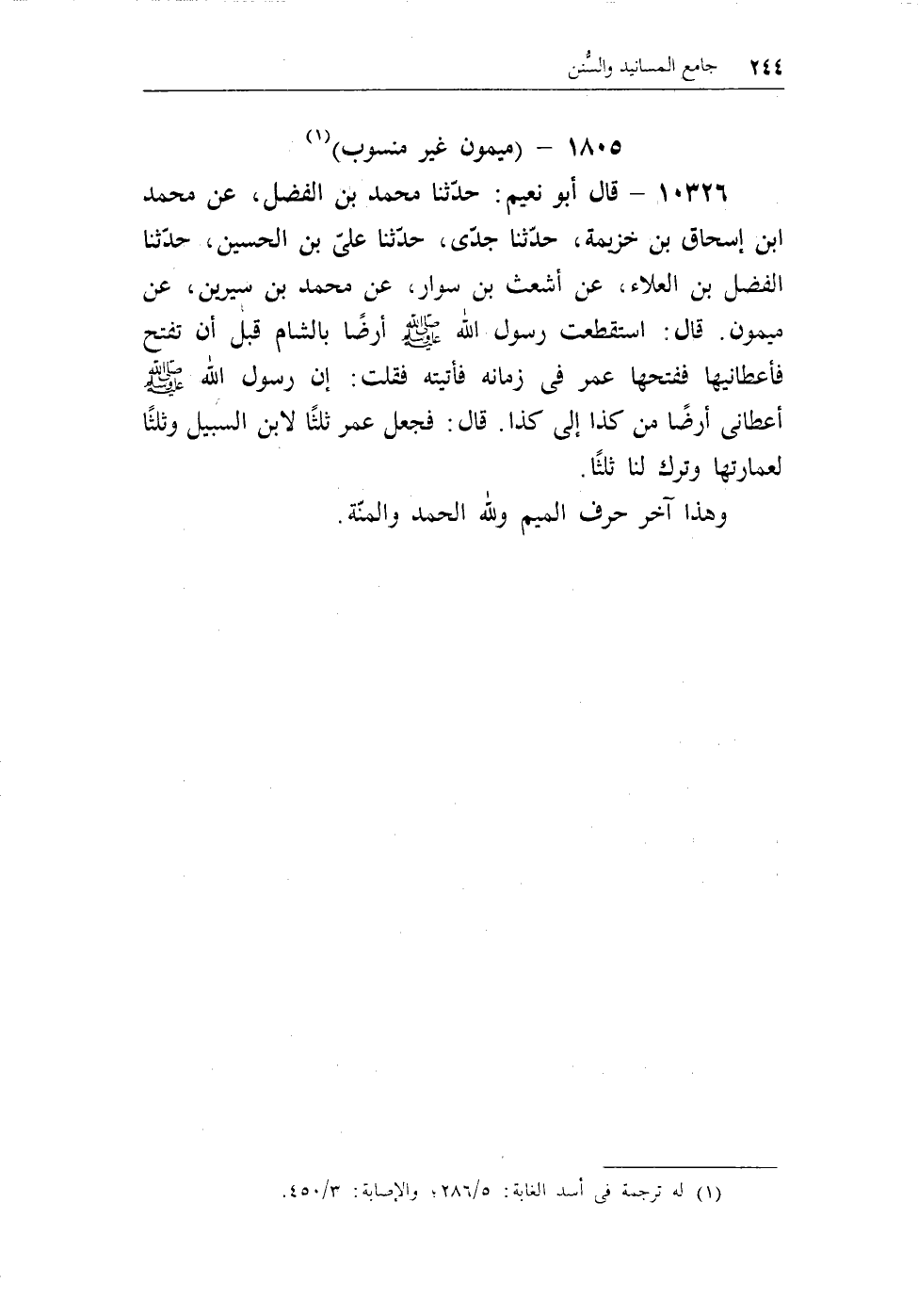 10326 - قال أبو نعيم: حدثنا محمد بن الفضل، عن محمد بن إسحاق بن خزيمة، حدثنا جدى، حدثنا جدى، حدثنا على بن الحسين، حدثنا الفضل بن العلاء، عن أشعث بن سوار، عن محمد بن سيرين، عن ميمون. قال: استقطعت رسول الله - صلى الله عليه وسلم - أرضا بالشام قبل أن تفتح فأعطانيها ففتحها عمر فى زمانه فأتيته فقلت: إن رسول الله - صلى الله عليه وسلم - أعطانى أرضا من كذا إلى كذا. قال: فجعل عمر ثلثا لابن السبيل وثلثا لعمارتها وترك لنا ثلثا.