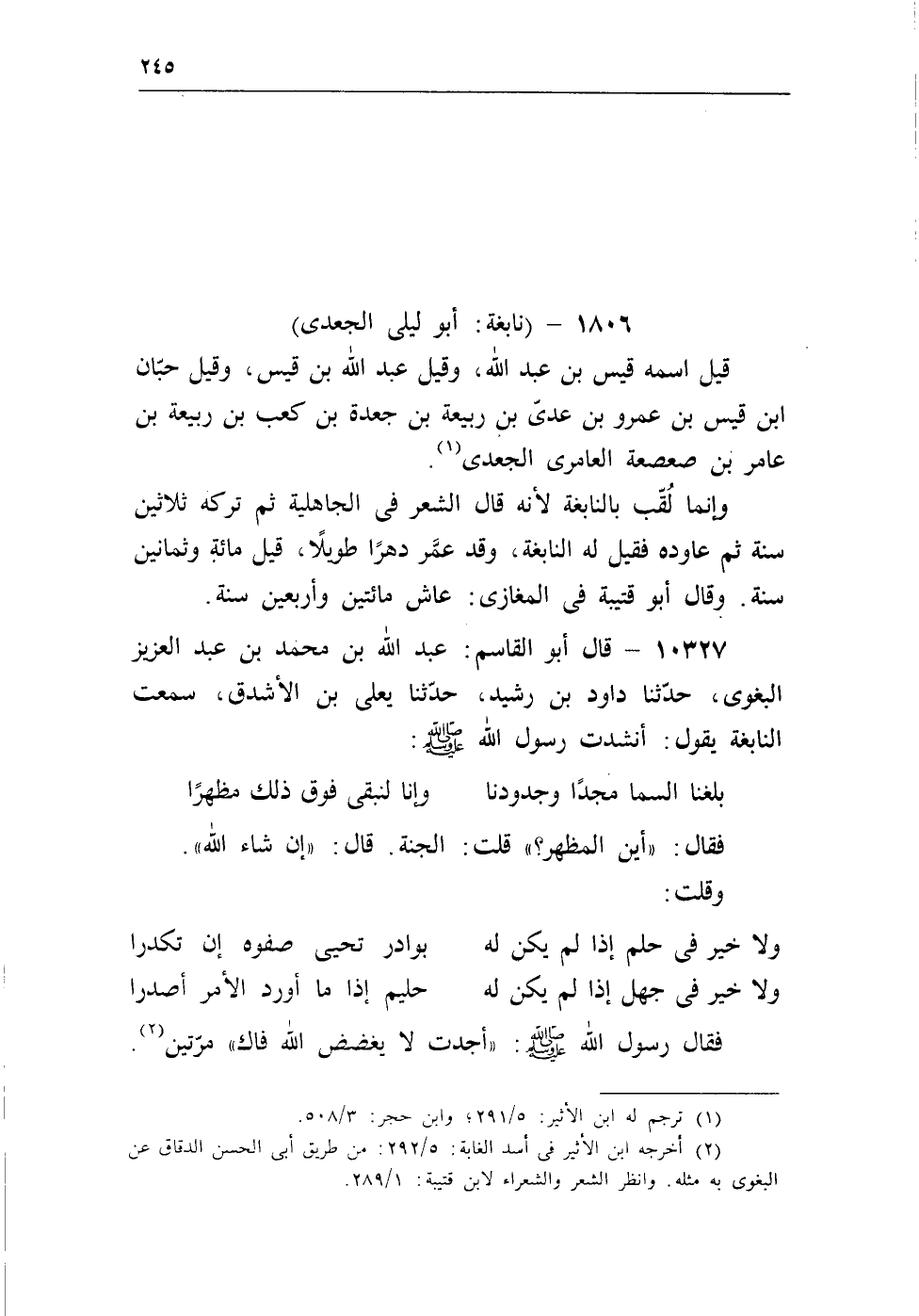 10327 - قال أبو القاسم: عبد الله بن محمد بن عبد العزيز البغوى، حدثنا داود بن رشيد، حثنا يعلى بن الأشدق، سمعت النابغة يقول: أنشدت رسول الله - صلى الله عليه وسلم -: