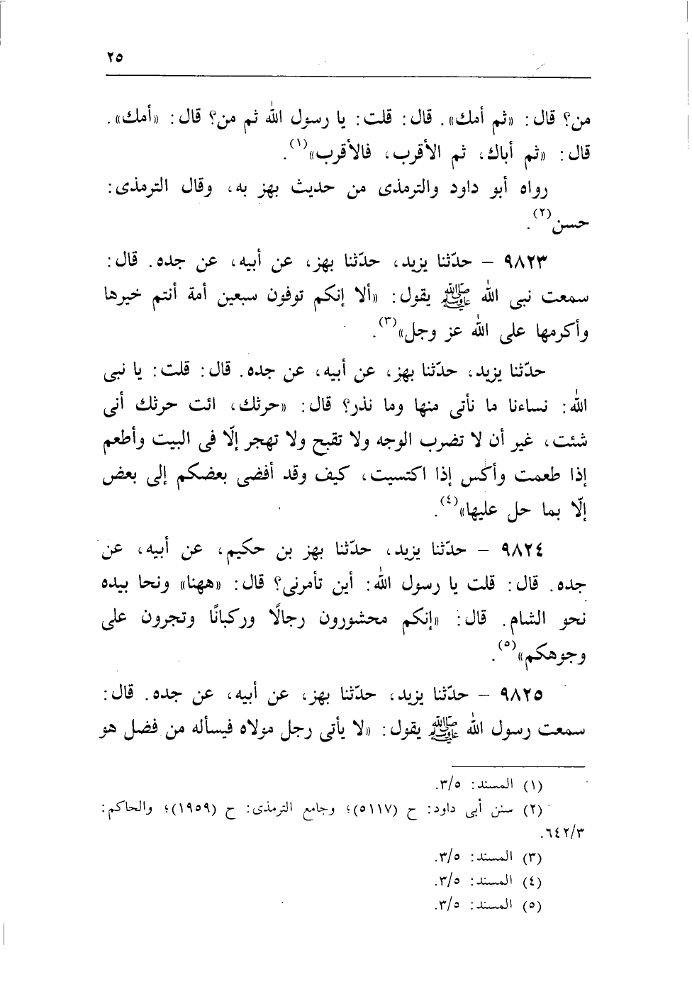 9825 - حدثنا يزيد، حدثنا بهز، عن أبيه، عن جده. قال: سمعت رسول الله - صلى الله عليه وسلم - يقول: «لا يأتى رجل مولاه فيسأله فضل هو