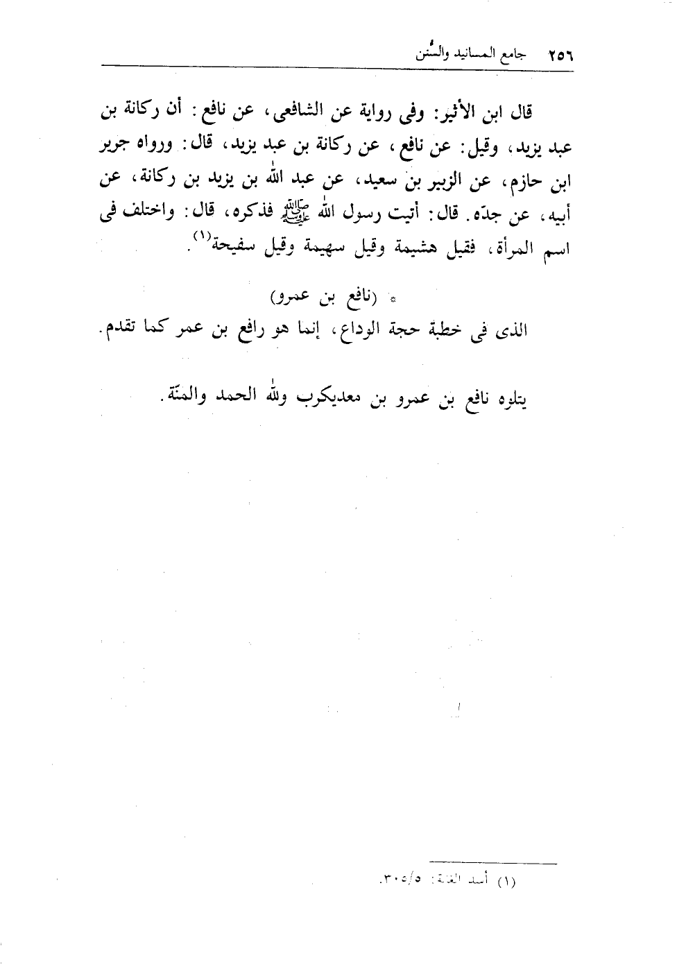 قال ابن الأثير: وفى رواية عن الشافعى، عن نافع: أن ركانة بن عبد يزيد، وقيل: عن نافع، عن ركانة بن عبد يزيد، قال: ورواه جرير ابن حازم، عن الزبير بن سعيد، عن عبد الله بن يزيد بن ركانة، عن أبيه، عن جده. قال: أتيت رسول الله - صلى الله عليه وسلم - فذكره، قال: واختلف فى اسم المراة، فقيل هشيمة وقيل سهمية وقيل سفيحة (¬1) .