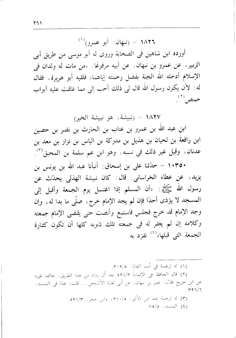 (¬2) قال الحافظ فى الإصابة 3/521 بعد أن رواه من هذا الطريق: خالفه غيره عن ابن جريج فقال: عمر بن نبهان، عن أبى ثعلبة الأشجعى. قلت: هذا فى المسند: 6/396.