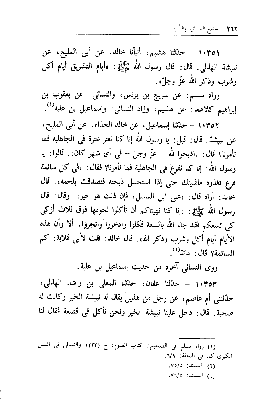 10351 - حدثنا هشيم، أنبانا خالد، عن أبى المليح، عن نبيشة الهذلى. قال: قال رسول الله - صلى الله عليه وسلم -: «أيام التشريق أيام أكل وشرب وذكر الله عز وجل» .