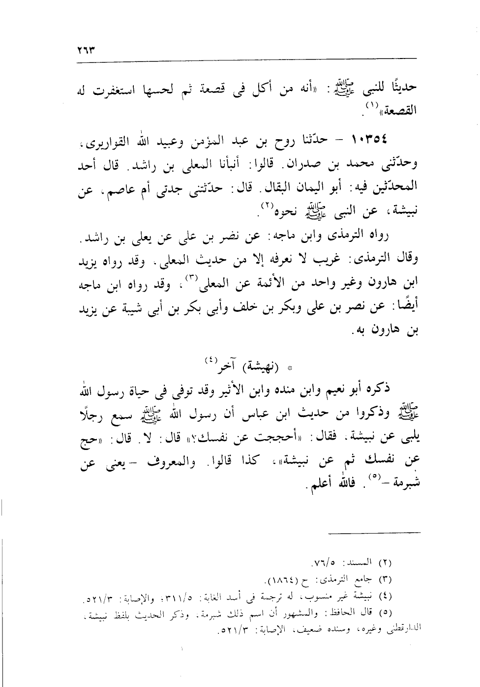 (¬4) قال الحافظ: والمشهور أن اسم ذلك شبرمة، وذكر الحديث بلفظ نبيشة الدارقطنى وغيره، وسنده ضعيف، الإصابة: 3/521.