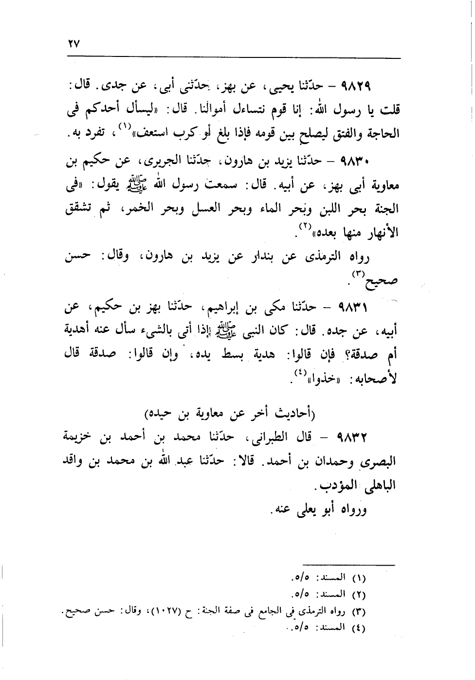 9830 - حدثنا يزيد بن هارون، حدثنا الجريرى، عن حكيم بن معاوية أبى بهز، عن أبيه. قال: سمعت رسول الله - صلى الله عليه وسلم - يقول: «فى الجنة بحر اللبن وبحر الماء وبحر العسل وبحر الخمر، ثم تشقق الأنهار منها بعده» (¬2) .