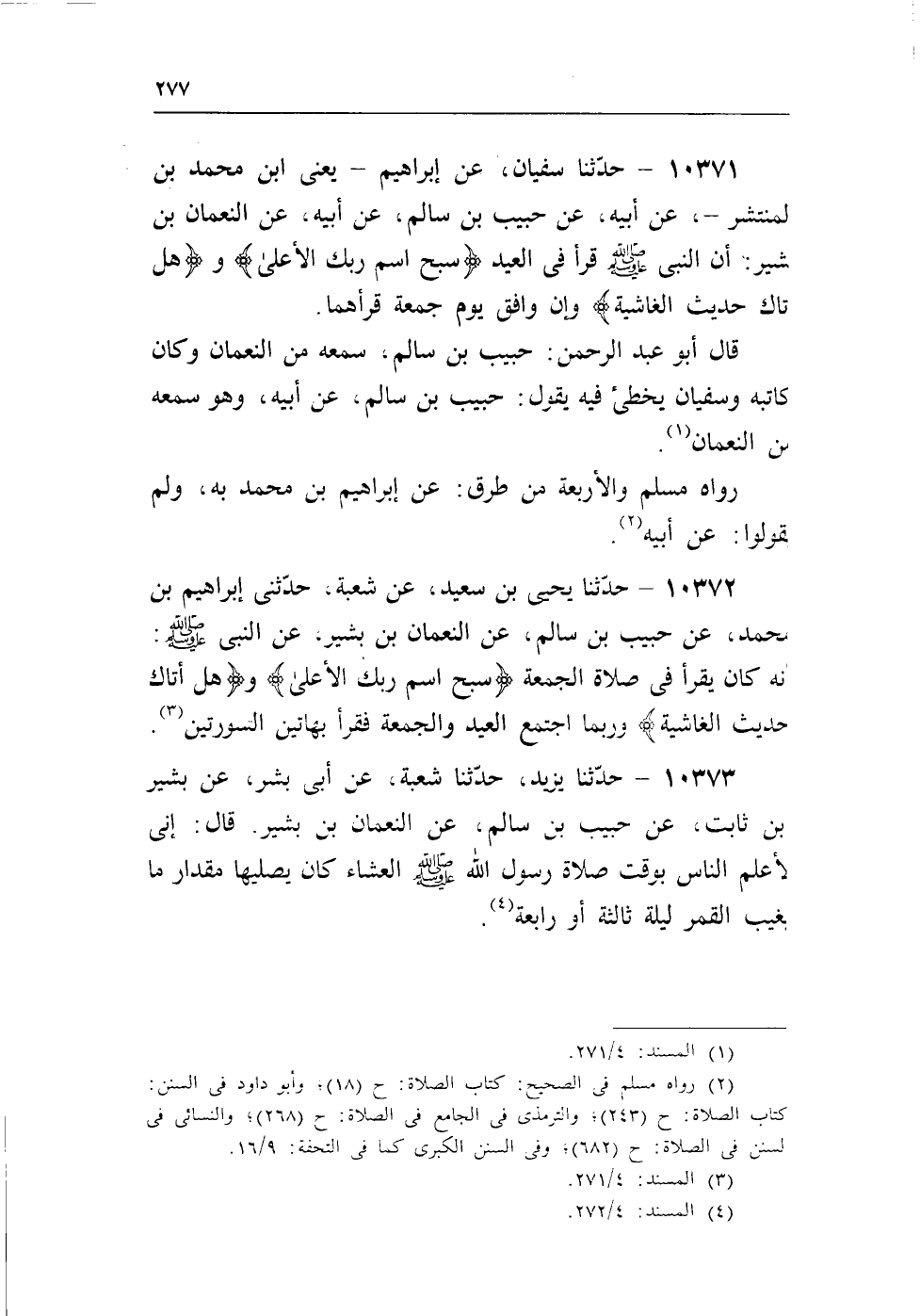 10371 - حدثنا سفيان، عن إبراهيم- يعنى ابن محمد بن لمنتشر-، عن أبيه، عن حبيب بن سالم، عن أبيه، عن النعمان بن بشير: أن النبى - صلى الله عليه وسلم - قرأ فى العيد (سَبِّحِ اسْمَ رَبِّكَ الْأَعْلَى) . و (هَلْ أَتَاكَ حَدِيثُ الْغَاشِيَةِ) وإن وافق يوم جمعة قرأهما. قال أبو عبد الرحمن: حبيب بن سالم، سمعه من النعمان وكان كاتبه وسفيان يخطىء فيه يقول: حبيب بن سالم، عن أبيه، وهو سمعه من النعمان (¬1) .