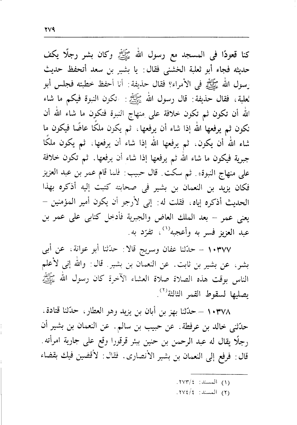 كنا قعودا فى المسجد مع رسول الله - صلى الله عليه وسلم - وكان بشررجلا يكف حديثه فجاء أبو ثعلبة الخشنى فقال: يا بشير بن سعد أتحفظ حديث رسول الله - صلى الله عليه وسلم - فى الأمراء؟ فقال حذيفة: أنا أحفظ خطبته فجلس أبو ثعلبة، فقال حذيفة: قال رسول الله - صلى الله عليه وسلم -: تكون النبوة فيكم ما شاء الله أن تكون ثم تكون خلافة على منهاج النبوة فتكون ما شاء الله أن تكون ثم يرفعها الله إذا شاء أن يرفعها، ثم يكون ملكا عاضا فيكون ما شاء الله أن يكون، ثم يرفعها إذا شاء أن يرفعها، ثم يكون ملكا جبرية فيكون ما شاء الله ثم يرفعها إذا شاء أن يرفعها، ثم تكون خلافة على منهاج النبوة» . ثم سكت. قال حبيب: فلما قام عمر بن عبد العزيز فكان يزيد بن النعمان بن بشير فى صحابته كتبت إليه أذكره بهذا الحديث أذكره إياه، فقلت له: إنى لأرجو أن يكون أمير المؤمنين- يعنى عمر- بعد الملك العاض والجبرية فأدخل كتابى على عمر بن عبد العزيز فسر به وأعجبه (¬1) ، تفرد به.