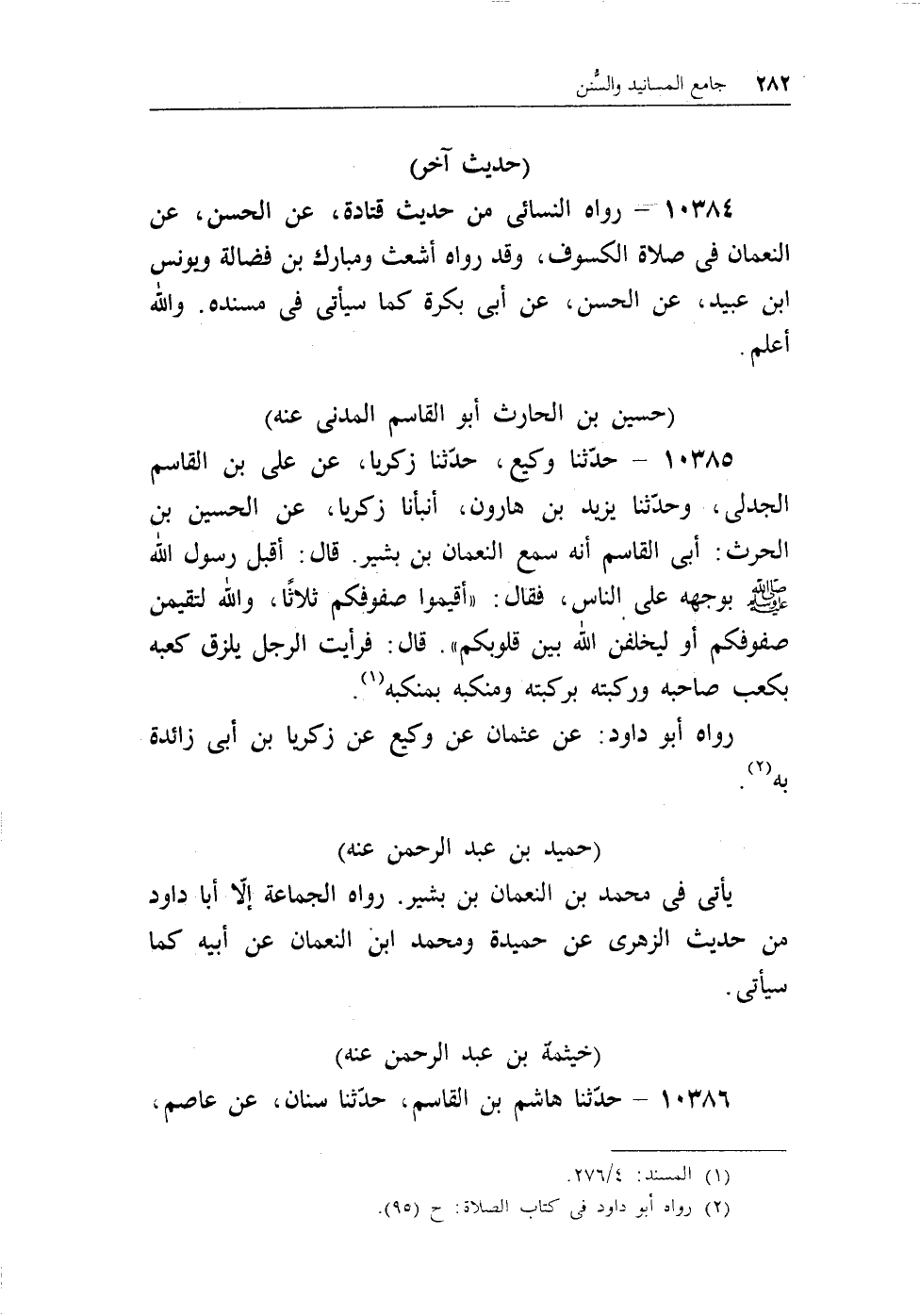 10385 - حدثنا وكيع، حدثنا زكريا، عن على بن القاسم الجدلى، وحدثنا يزيد بن هارون، أنبانا زكريا، عن الحسين بن الحرث: أبى القاسم أنه سمع النعمان ابن بشير. قال: أقبل رسول الله - صلى الله عليه وسلم - بوجهه على الناس، فقال: «أقيموا صفوفكم ثلاثا، والله لتقيمن صفوفكم أو ليخلفن الله بين قلوبكم» . قال: فرأيت الرجل يلزق كعبه بكعب صاحبه وركبته بركبته ومنكبه بمنكبه (¬1) .
