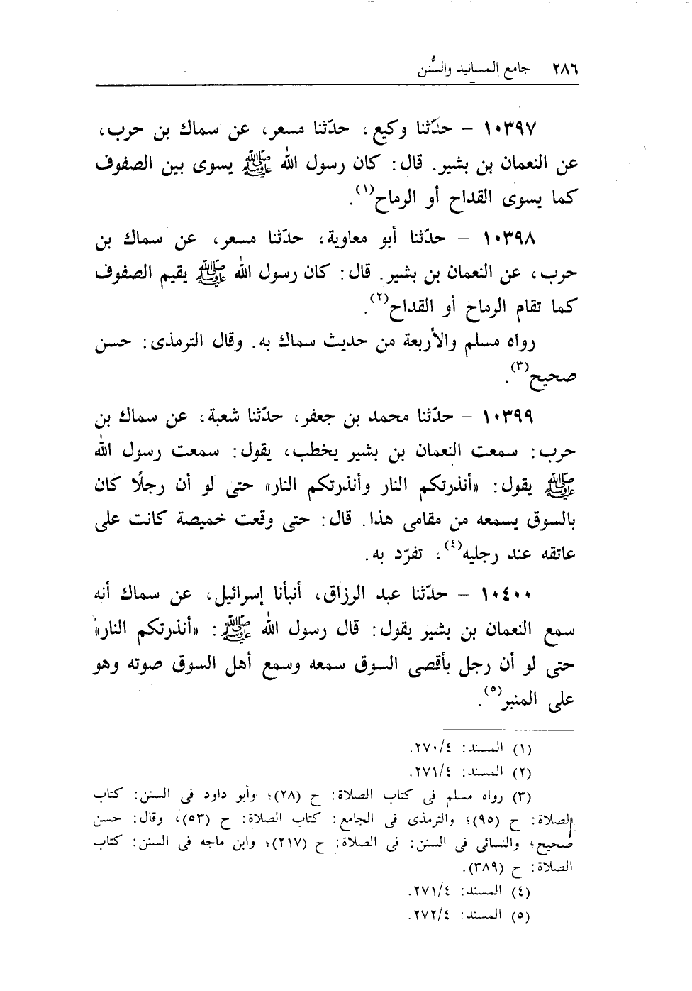 10397 - حدثنا وكيع، حدثنا مسعر، عن سماك بن حرب، عن النعمان بن بشير. قال: كان رسول الله - صلى الله عليه وسلم - يسوى بين الصفوف كما يسوى القداح أو الرماح (¬1) .