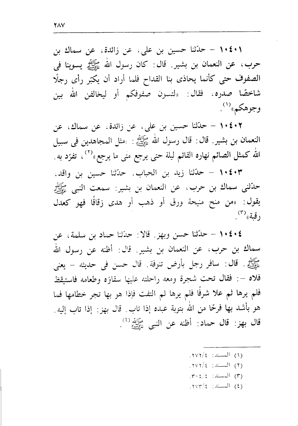 10404 - حدثنا حسن وبهز. قالا: حدثنا حماد بن سلمة، عن سماك بن حرب، عن النعمان بن بشير. قال: أظنه عن رسول الله - صلى الله عليه وسلم -. قال: سافر رجل بأرض تنوفة. قال حسن فى حديثه- يعنى فلاه-: فقال تحت شجرة ومعه راحلته عليها سقاؤه وطعامه فاستيقظ فلم يرها ثم علا شرفا فلم يرها ثم التفت فإذا هو بها تجر خطامها فما هو بأشد بها فرحا من الله بتوبة عبده إذا تاب. قال بهز: إذا تاب إليه. قال بهز: قال حماد: أظنه عن النبى - صلى الله عليه وسلم - (¬4) .