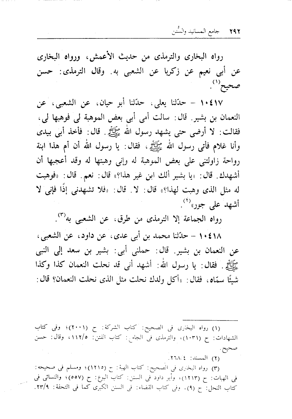 (¬2) رواه البخارى فى الصحيح: كتاب الهبة: ح (1215) ؛ ومسلم فى صحيحه: فى الهبات: ح (1213) ؛ وأبو داود فى السنن: كتاب البوع: ح (557) ؛ والنسائى فى كتاب النحل: ح (9) . وفى كتاب القضاء: فى السنن الكبرى كما فى التحفة: 9/23.