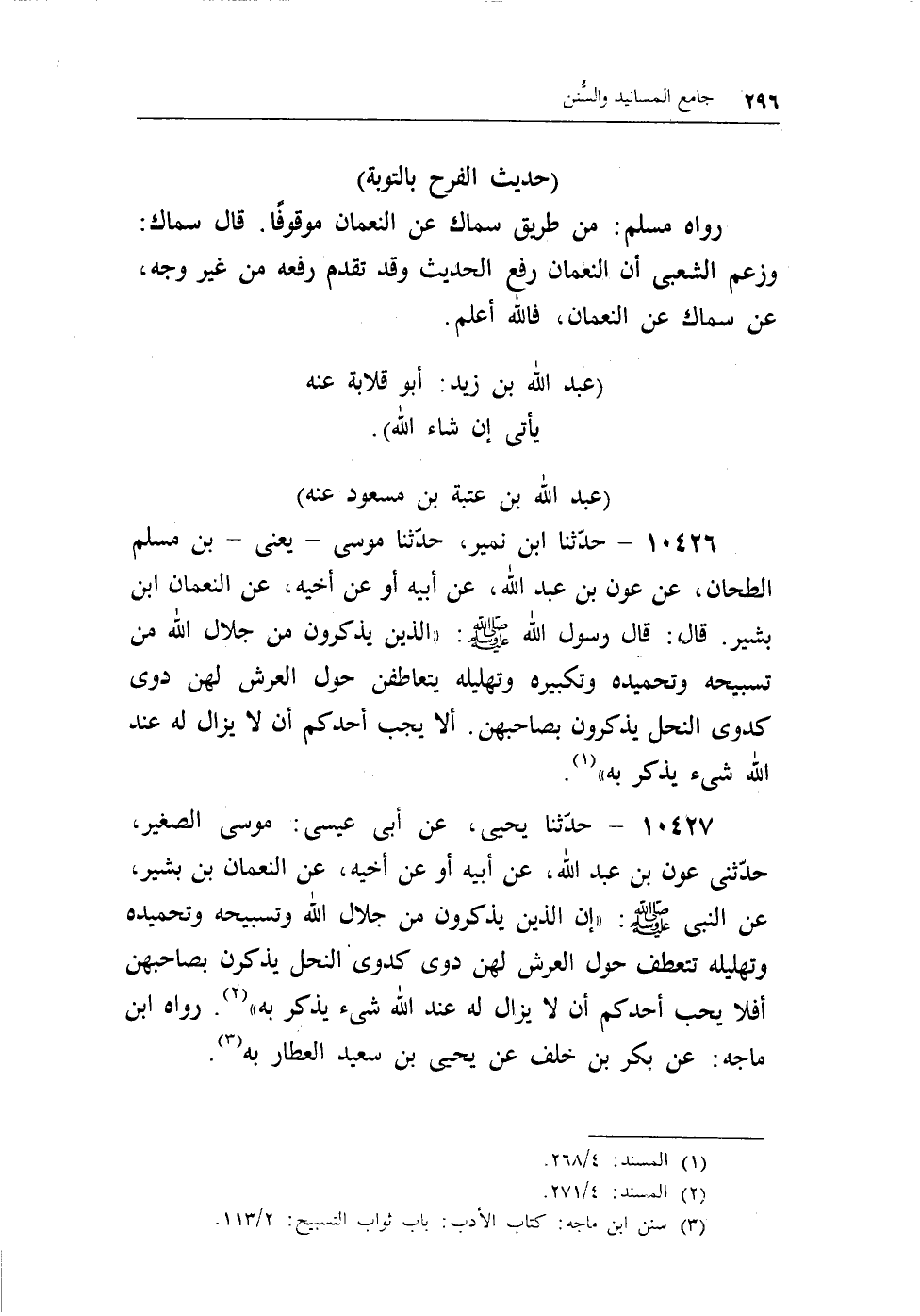 10426 - حدثنا ابن نمير، حدثنا موسى- يعنى- بن مسلم الطحان، عن عون بن عبد الله، عن أبيه أو عن أخيه، عن النعمان ابن بشير. قال: قال رسول الله - صلى الله عليه وسلم -: «الذين يذكرون من جلال الله من تسبيحه وتحميده وتكبيره وتهليله يتعاطفن حول العرش لهن دوى كدوى النحل يذكرون بصاحبهن. الا يجب أحدكم ان لا يزال له عند الله شىء يذكر به» (¬1) .