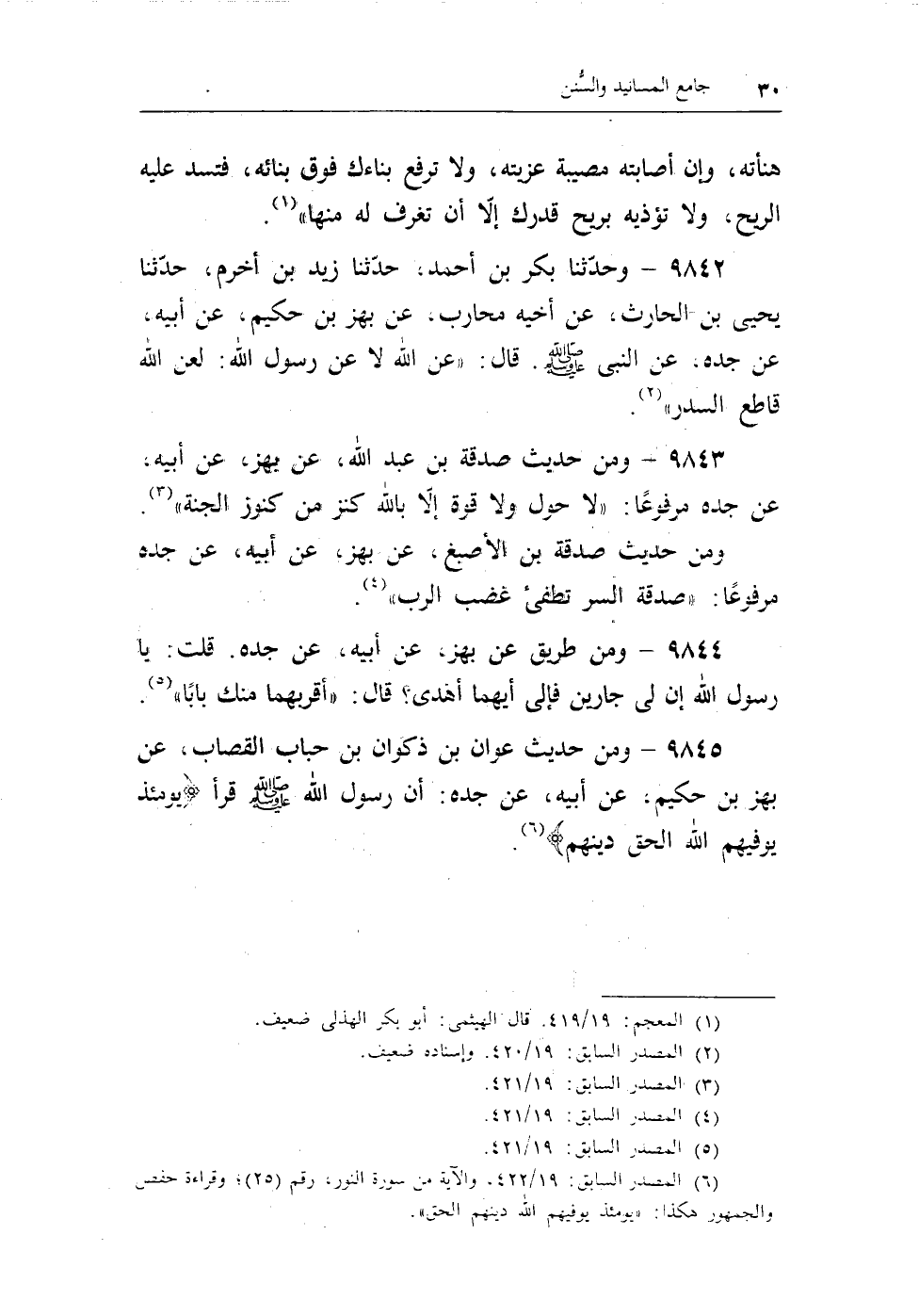 9843 - ومن حديث صدقة بن عبد الله، عن بهز، عن أبيه، عن جده مرفوعا: «لا حول ولا قوة إلا بالله كنز من كنوز الجنة» (¬2) .