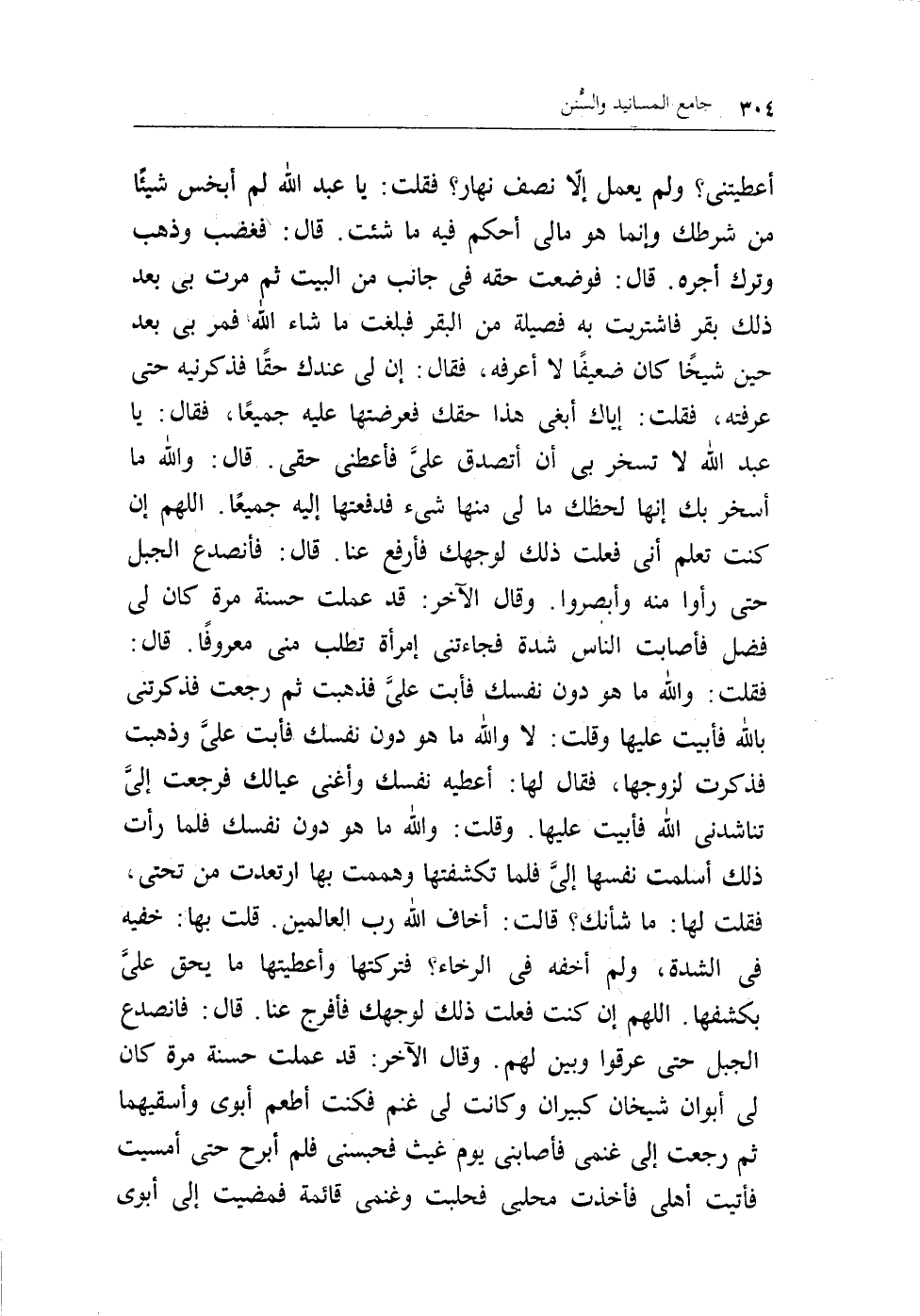 أعطيتنى؟ ولم يعمل إلا نصف نهار؟ فقلت: يا عبد الله لم أبخس شيئا من شرطك وإنما هو مالى أحكم فيه ما شئت. قال: فغضب وذهب وترك أجره. قال: فوضعت حقه فى جانب من البيت ثم مرت بى بعد ذلك بقر فاشتريت به فصيلة من البقر فبلغت ما شاء الله فمر بى بعد حين شيخا كان ضعيفا لا أعرفه، فقال: إن لى عندك حقا فذكرنيه حتى عرفته، فقلت: إياك أبغى هذا حقك فعرضتها عليه جميعا، فقال: يا عبد الله لا تسخر بى أن أتصدق على فأعطنى حقى. قال: والله ما أسخر بك إنها لحظك ما لى منها شىء فدفعتها إله جميعا. اللهم إن كنت تعلم أنى فعلت ذلك لوجهك فأرفع عنا. قال: فأنصدع الجبل حتى رأوا منه وأبصروا. وقال الآخر: قد عملت حسنة مرة كان لى فضل فأصابت الناس شدة فجاءتنى إمرأة تطلب منى معروفا.