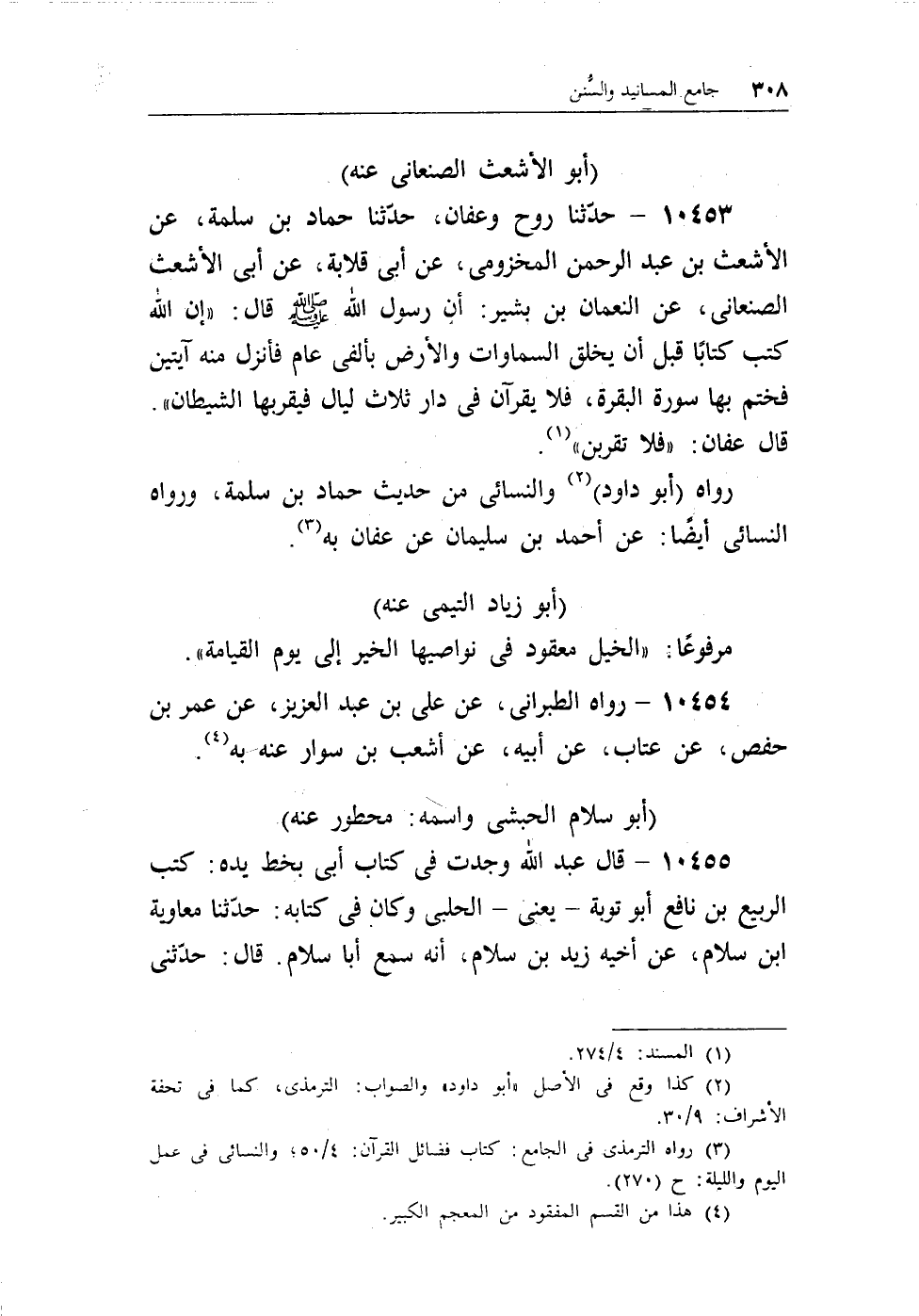 10453 - حدثنا روح وعفان، حدثنا حماد بن سلمة، عن الأشعث بن عبد الرحمن المخزومى، عن أبى قلابة، عن أبى الصنعانى، عن النعمان بن بشير: أن رسول الله - صلى الله عليه وسلم - قال: «إن الله كتب كتابا قبل أن يخلق السماوات والأرض بألفى عام فأنزل منه آيتين فختم بها سورة البقرة، فلا يقرآن فى دار ثلاث ليال فيقربها الشيطان» . قال: عفان: «فلا تقرين» (¬1) .