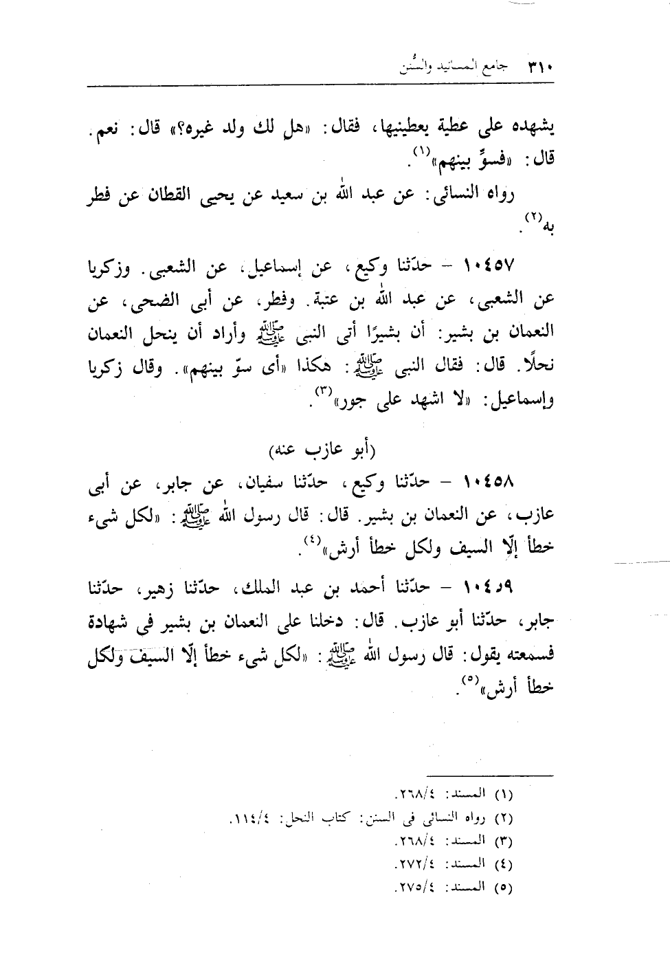 10457 - حدثنا وكيع، عن إسماعيل، عن الشعبى، وزكريا عن الشعبى، عن عبد الله بن عتبة. وفطر، عن أبى الضحى، عن النعمان بن بشير: أن بشيرا أتى النبى - صلى الله عليه وسلم - وأراد أن ينحل النعمان نحلا. قال: فقال النبى - صلى الله عليه وسلم -: هكذا «أى سو بينهم» . وقال زكريا وإسماعيل: «لا أشهد على جور» (¬1) .