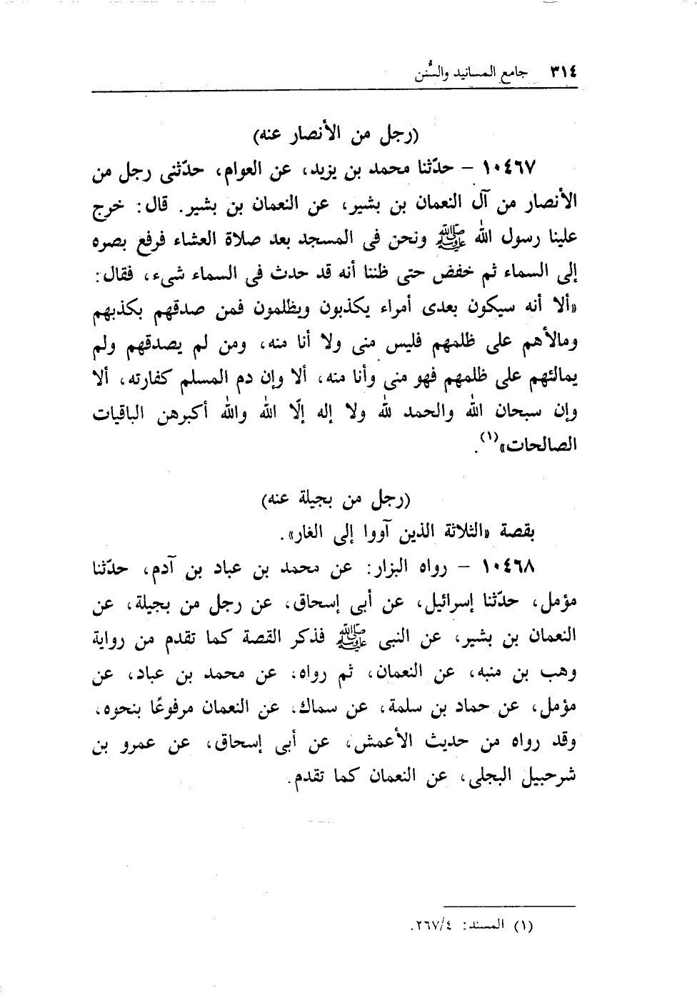 10467 - حدثنا محمد بن يزيد، عن العوام، حدثنى رجل من الأنصار من آل النعمان بن بشير، عن النعمان بن بشير. قال: خرج علينا رسول الله - صلى الله عليه وسلم - ونحن فى المسجد بعد صلاة العشاء فرفع بصره إلى السماء ثم خفض حتى ظننا أنه قد حدث فى السماء شىء، فقال: «ألا أنه سيكون بعدى أمراء يكذبون ويظلمون فمن صدقهم بكذبهم ومالأهم على ظلمهم فليس منى ولا أنا منه، ومن لم يصدقهم ولم يمالئهم على ظلمهم فهو منى وأنا منه، ألا وإن دم المسلم كفارته، ألا وإن سبحان الله والحمد لله ولا إله إلا الله والله أكبرهن الباقيات الصالحات» (¬1) .
