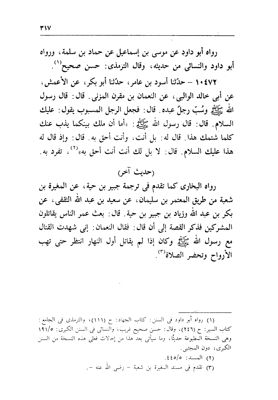 (¬1) رواه أبو داود فى السنن: كتاب الجهاد: ح (111) ؛ والترمذى فى الجامع: كتاب السير: ح (246) ، وقال: حسن صحيح غريب؛ والنسائى فى السنن الكبرى: 5/191 وهى النسخة المطبوعة حديثا؛ وما سيأتى بعد هذا من إحالات فعلى هذه النسخة من السنن الكبرى، دون المجتبى.