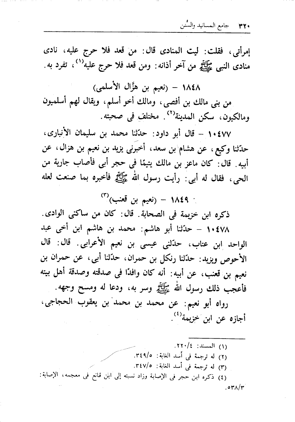 10478 - حدثنا أبو هاشم: محمد بن هاشم ابن أخى عبد الأحوص ابن عتاب، حدثنى عيسى بن نعيم الأعرابى. قال: قال نعيم بن قعنب، عن أبيه: أنه كان وافدا فى صدقته اهل بيته فأعجب ذلك رسول الله - صلى الله عليه وسلم - وسر به، ودعا له ومسح وجهه.