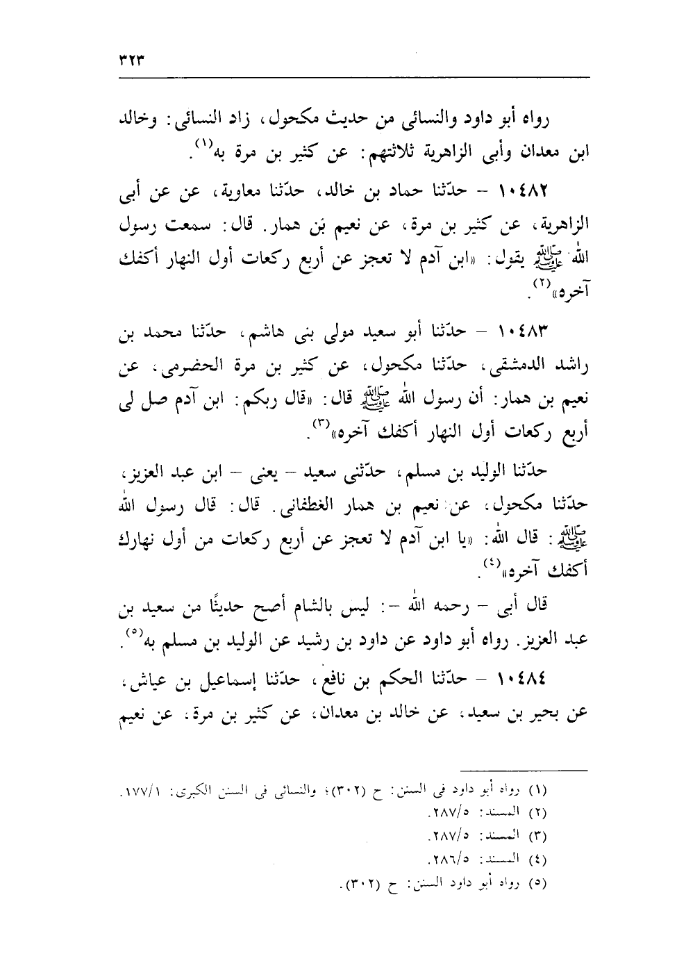 10483 - حدثنا أبو سعيد مولى بنى هاشم، حدثنا محمد بن راشد الدمشقى، حدثنا مكحول، عن كثير بن مرة الحضرمى، عن نعيم بن همار: أن رسول الله - صلى الله عليه وسلم - قال: «قال ربكم: ابن آدم صل لى أربع ركعات أول النهار أكفك آخره» (¬2) .