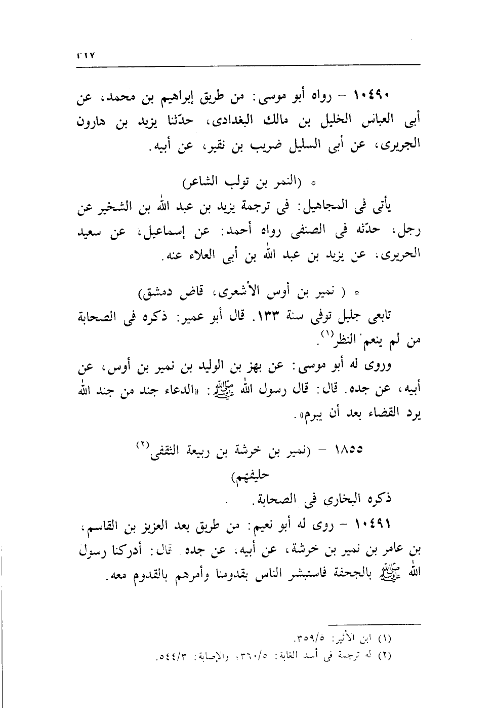 10490 - رواه أبو موسى: من طريق إبراهيم بن محمد، عن أبى العباس الخليل بن مالك البغدادى، حدثنا يزيد ن هارون الجريرى، عن أبى السليل ضريب ابن نقير، عن أبيه.