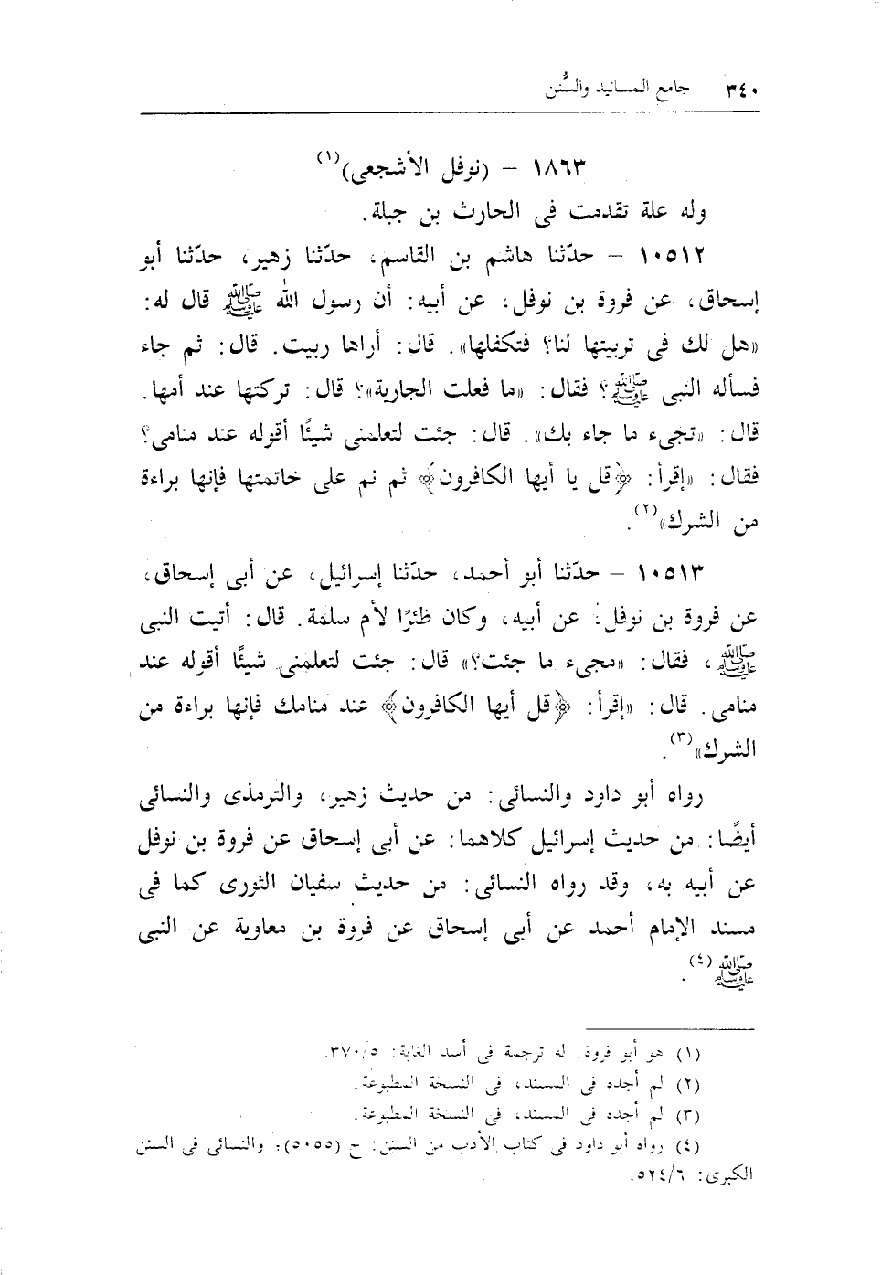 10512 - حدثنا هاشم بن القاسم، حدثنا زهير، حدثنا أبو إسحاق، عن فروة بن نوفل، عن أبيه: أن رسول الله - صلى الله عليه وسلم - قال له: «هل لك فى تربيتها لنا؟ فتكفلها» . قال: أراها ربيت. قال: ثم جاء فسأله النبى - صلى الله عليه وسلم -؟ فقال: «ما فعلت الجارية» ؟ قال: تركتها عند أمها. قال: «تجىء ما جاء بك» . قال: جئت لتعلمنى شيئا أقوله عند منامى؟ فقال: «إقرأ: (قُلْ يَا أَيُّهَا الْكَافِرُونَ) ثم نم على خاتمتها فإنها براءة من الشرك» (¬2) .