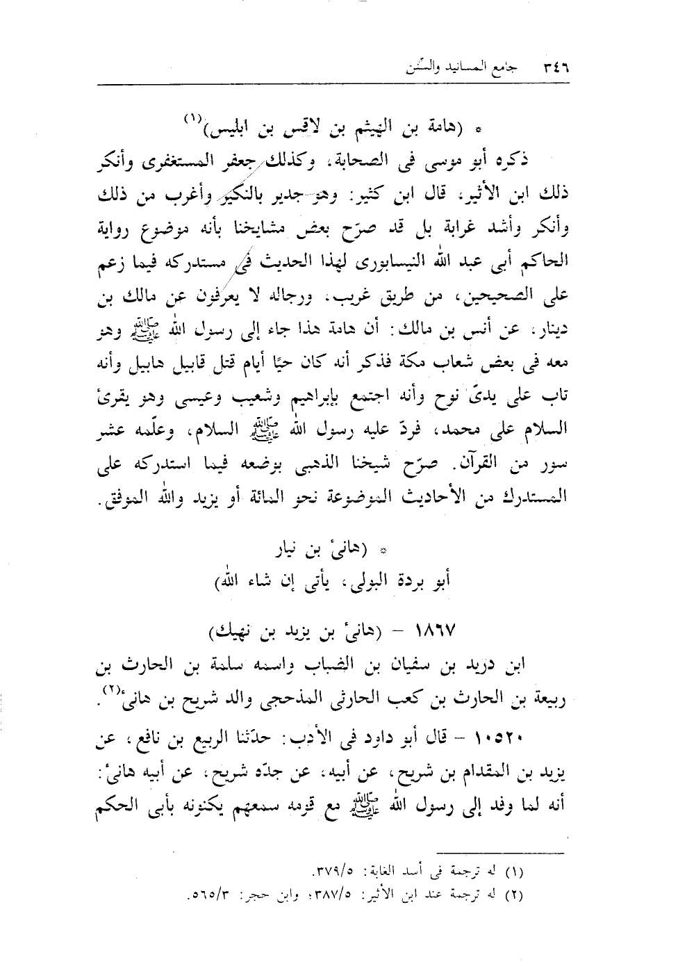 ذكره أبو موسى فى الصحابة، وكذلك جعفر المستغفرى وأنكر ذلك ابن الأثير، قال ابن كثير: وهو جدير بالنكير وأغرب من ذلك وأنكر وأشد غرابة بل قد صرح بعض مشايخنا بأنه موضوع رواية الحاكم أبى عبد الله النيسابورى لهذا الحديث فى مستدركه فيما زعم على الصحيحين، من طريق غريب، ورجاله لا يعرفون عن مالك بن دينار، عن أنس بن مالك: أن هامة هذا جاء إلى رسول الله - صلى الله عليه وسلم - وهو معه فى بعض شعاب مكة فذكر أنه كان حيا أيام قتل قابيل هابيل وأنه تاب على يدى نوح وأنه اجتمع بإبراهيم وشعيب وعيسى وهو يقرىء السلام على محمد، فرد عليه رسول الله - صلى الله عليه وسلم - السلام، وعلمه عشر سور من القرآن. صرح شيخنا الذهبى بوضعه فيما استدركه على المستدرك من الأحاديث الموضوعة نحو المائة أو يزيد والله الموفق.