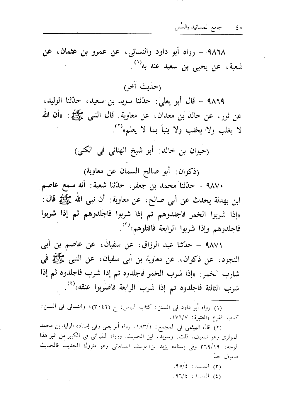 9870 - حدثنا محمد بن جعفر، حدثنا شعبة: أنه سمع عاصم ابن بهدلة يحدث عن أبى صالح، عن معاوية: أن نبى الله - صلى الله عليه وسلم - قال: «إذا شربوا الخمر فاجلدوهم ثم إذا شربوا فاجلدوهم ثم إذا شربوا فاجلدوهم وإذا شربوا الرابعة فاقتلوهم» (¬3) .