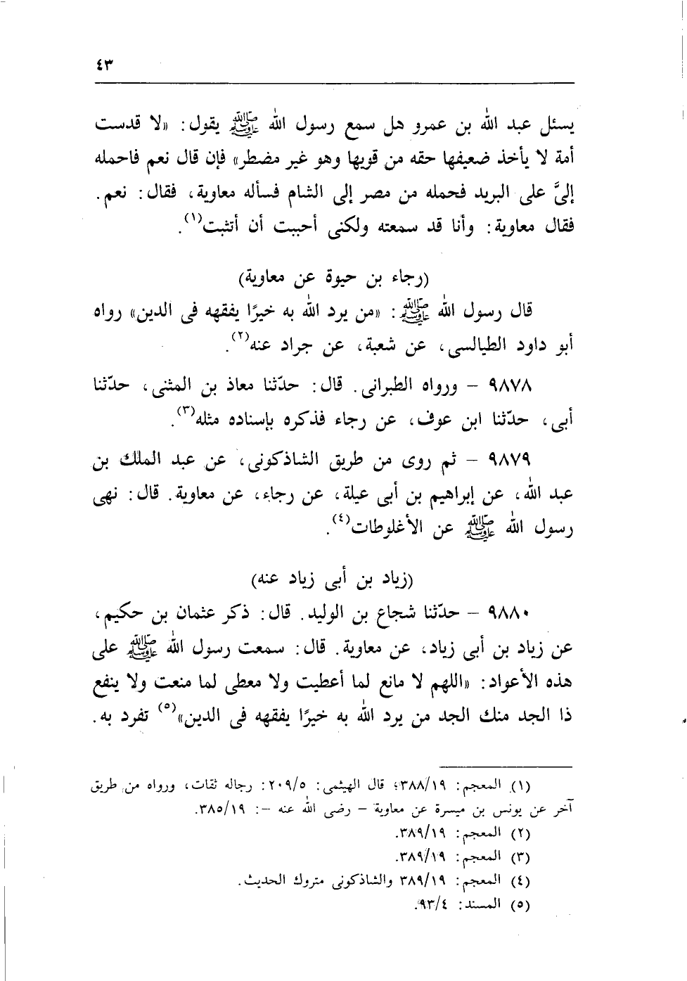 (¬1) المعجم: 19/388؛ قال الهيثمى: 5/209: رجاله ثقات، ورواه من طريق آخر عن يونس بن ميسرة عن معاوية- رضى الله عنه-: 19/385.