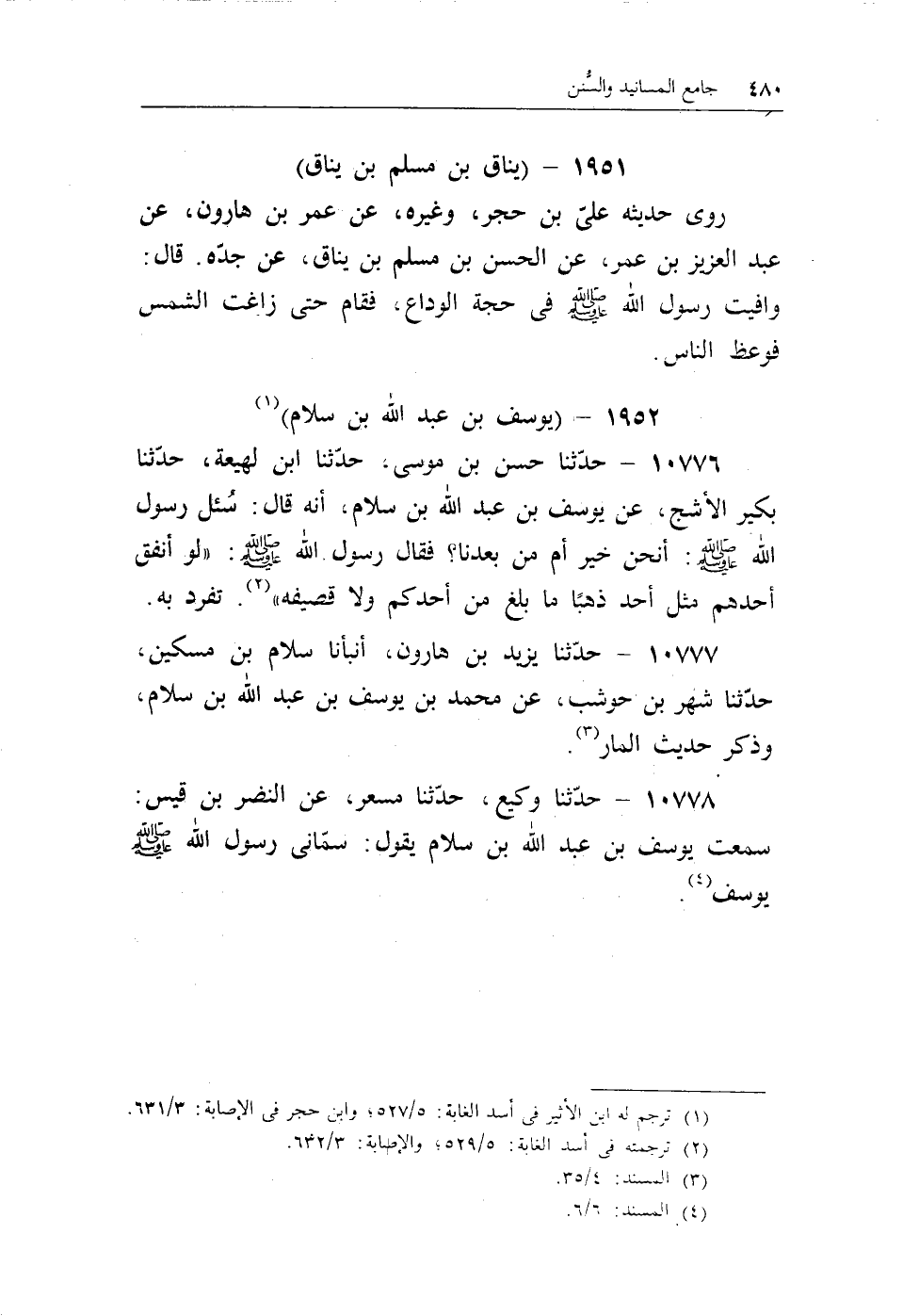 10776 - حدثنا حسن بن موسى، حدثنا ابن لهيعة، حدثنا بكير الأشج، عن يوسف بن عبد الله بن سلام، أنه قال: سئل رسول الله - صلى الله عليه وسلم -: أنحن خير أم من بعدنا؟ فقال رسول الله - صلى الله عليه وسلم - «لو أنفق أحدهم مثل أحد ذهباً ما بلغ من أحدكم ولا قصيفة» (¬2) . تفرد به.