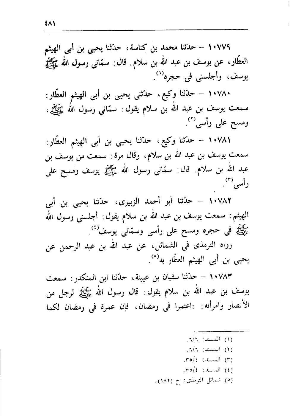 10782 - حدثنا أبو أحمد الزبيرى، حدثنا يحيى بن أبى الهيثم: سمعت يوسف ابن عبد الله بن سلام يقول: أجلسنى رسول الله - صلى الله عليه وسلم - فى حجرة ومسح على رأسى وسمانى يوسف (¬4) .