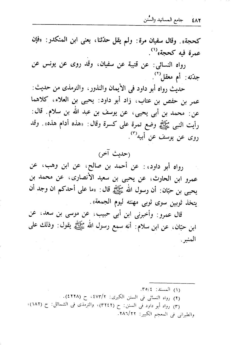 قال عمرو: وأخبرنى ابن أبى حبيب، عن موسى بن سعد، عن ابن حبان، عن ابن سلام: أنه سمع رسول الله - صلى الله عليه وسلم - يقول: وذلك على المنبر.