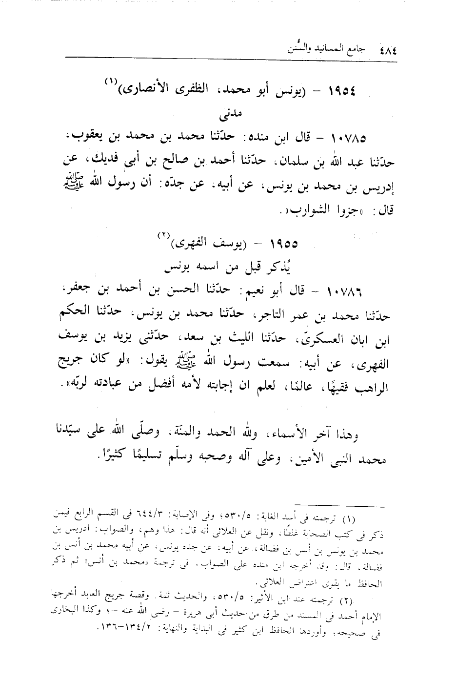 (¬1) ترجمته فى أسد الغابة: 5/530؛ وفى الإصابة: 3/644 فى القسم الرابع فيمن ذكر فى كتب الصحابة غلطاً، ونقل عن العلائى أنه قال: هذا وهم، والصواب: إدريس بن محمد بن يونس بن أنس بن فضالة، عن أبيه، عن جده يونس، عن أبيه محمد بن أنس بن فضالة، قال: وقد أخرجه ابن منده على الصواب. فى ترجمة «محمد بن أنس» ثم ذكر الحافظ ما يقوى اعتراض العلائى.