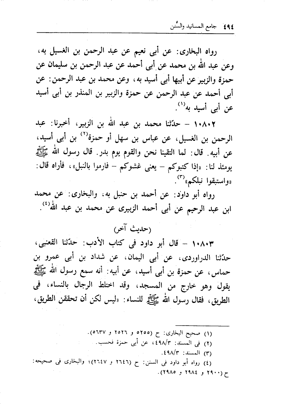 10803 - قال أبو داود فى كتاب الأدب: حدثنا القعنبى، حدثنا الدراوردى، عن أبى اليمان، عن شداد بن أبى عمرو بن حماس، عن حمزة بن أبى أسيد، عن أبيه: أنه سمع رسول الله - صلى الله عليه وسلم - يقول وهو خارج من المسجد، وقد اختلط الرجال بالنساء، فى الطريق، فقال رسول الله - صلى الله عليه وسلم - للنساء: «ليس لكن أن تحققن الطريق،