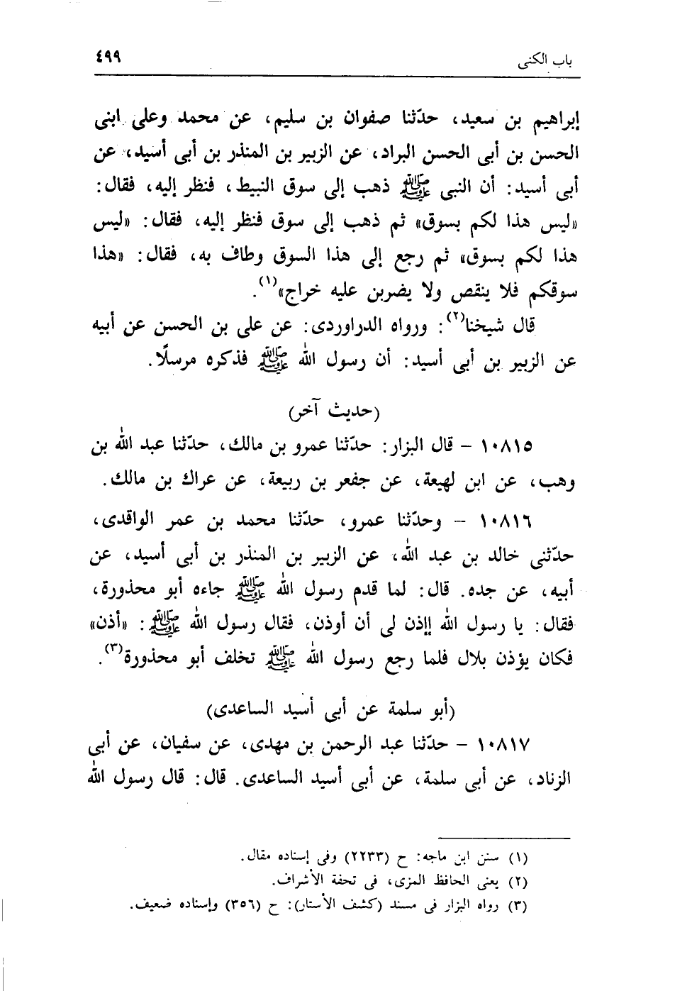 إبراهيم بن سعيد، حدثنا صفوان بن سليم، عن محمد وعلى ابنى الحسن بن أبى الحسن البراد، عن الزبير بن المنذر بن أبى أسيد، عن أبى أسيد: أن النبى - صلى الله عليه وسلم - ذهب إلى سوق النبيط، فنظر إليه، فقال: «ليس هذا لكم بسوق» ثم ذهب إلى سوق فنظر إليه، فقال: «ليس هذا لكم بسوق» ثم رجع إلى هذا السوق وطاف به، فقال: «هذا سوقكم فلا ينقص ولا يضربن عليه خراج» (¬1) .