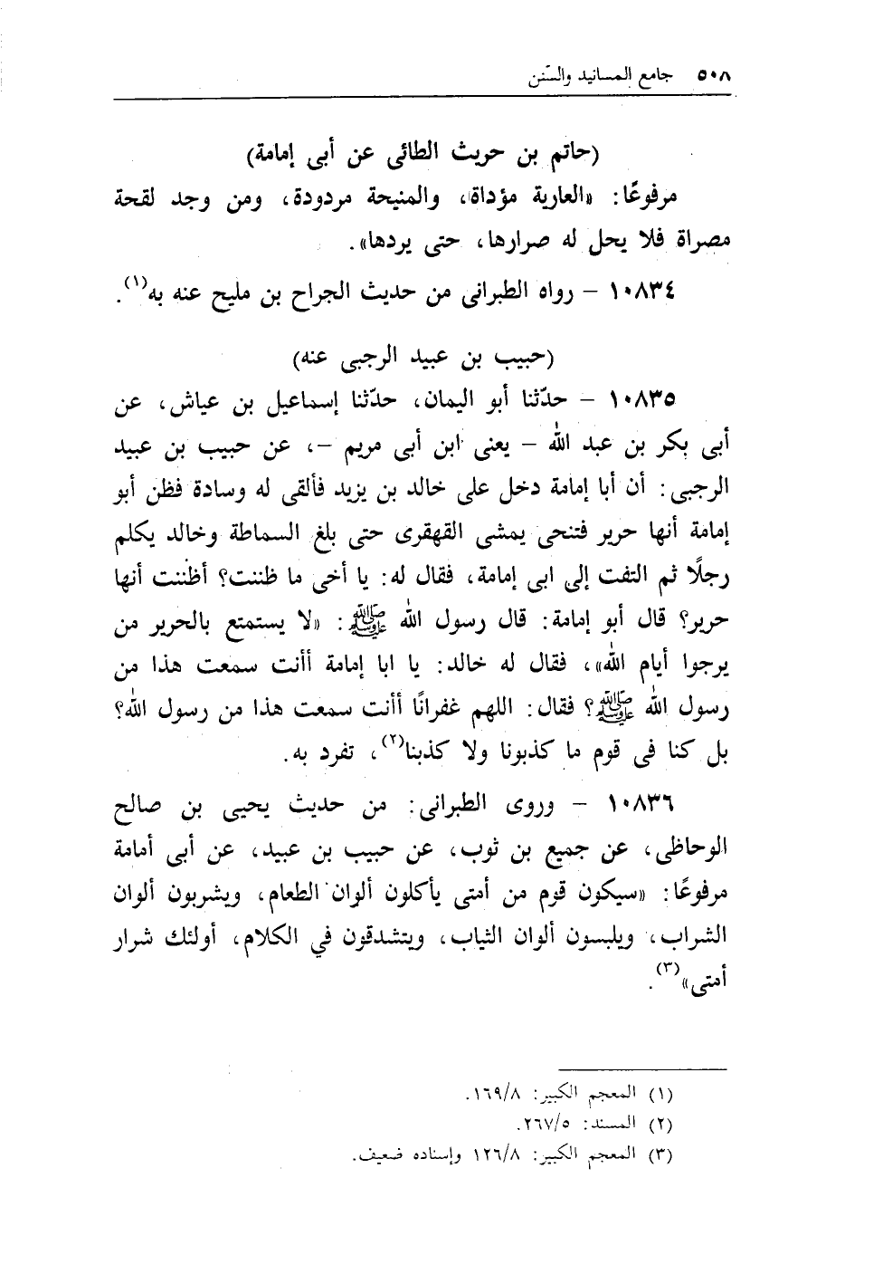 10835 - حدثنا أبو اليمان، حدثنا إسماعيل بن عياش، عن أبى بكر بن عبد الله ـ يعنى ابن أبى مريم ـ، عن حبيب بن عبيد الرجبى: أن أبا إمامة دخل على خالد بن يزيد فألقى له وسادة فظن أبو إمامة أنها حرير فتنحى يمشى القهقرى حتى بلغ السماطة وخالد يكلم رجلاً ثم التفت إلى أبى إمامة، فقال له: يا أخى ما ظننت؟ أظننت أنها حرير؟ قال أبو إمامة: قال رسول الله - صلى الله عليه وسلم -: «لا يستمتع بالحرير من يرجو أيام الله» ، فقال له خالد: يا أبا إمامة أأنت سمعت هذا من رسول الله - صلى الله عليه وسلم -؟ فقال: اللهم غفراناً أأنت سمعت هذا من رسول الله؟ بل كنا فى قوم ما كذبونا ولا كذبنا (¬2) ، تفرد به.